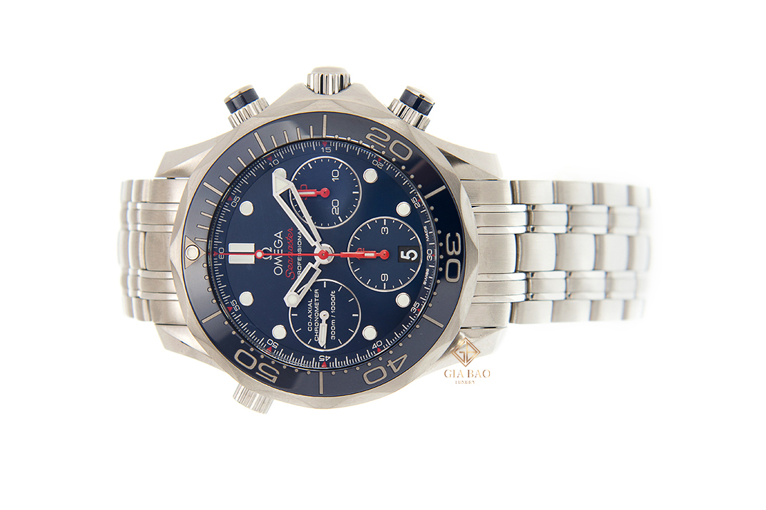 Ngoài chức năng chính là theo dõi thời gian, chiếc Omega Seamaster DIVER 300M 212.30.42.50.03.001 còn được tích hợp thêm chronograph và chronometer. Mặt số phụ ở vị trí 3h có chức năng đếm số phút, mặt số phụ ở vị trí 6h đảm nhiệm chức năng đếm giờ và mặt số phụ ở vị trí 9h đảm nhiệm chức năng đếm giây. Ngoài ra, cọc số 6h được thay bằng cửa sổ phụ hiển thị ngày trong tháng. Cọc số 12h thiết kế kiểu dáng baton và những cọc số còn lại thiết kế dáng tròn.