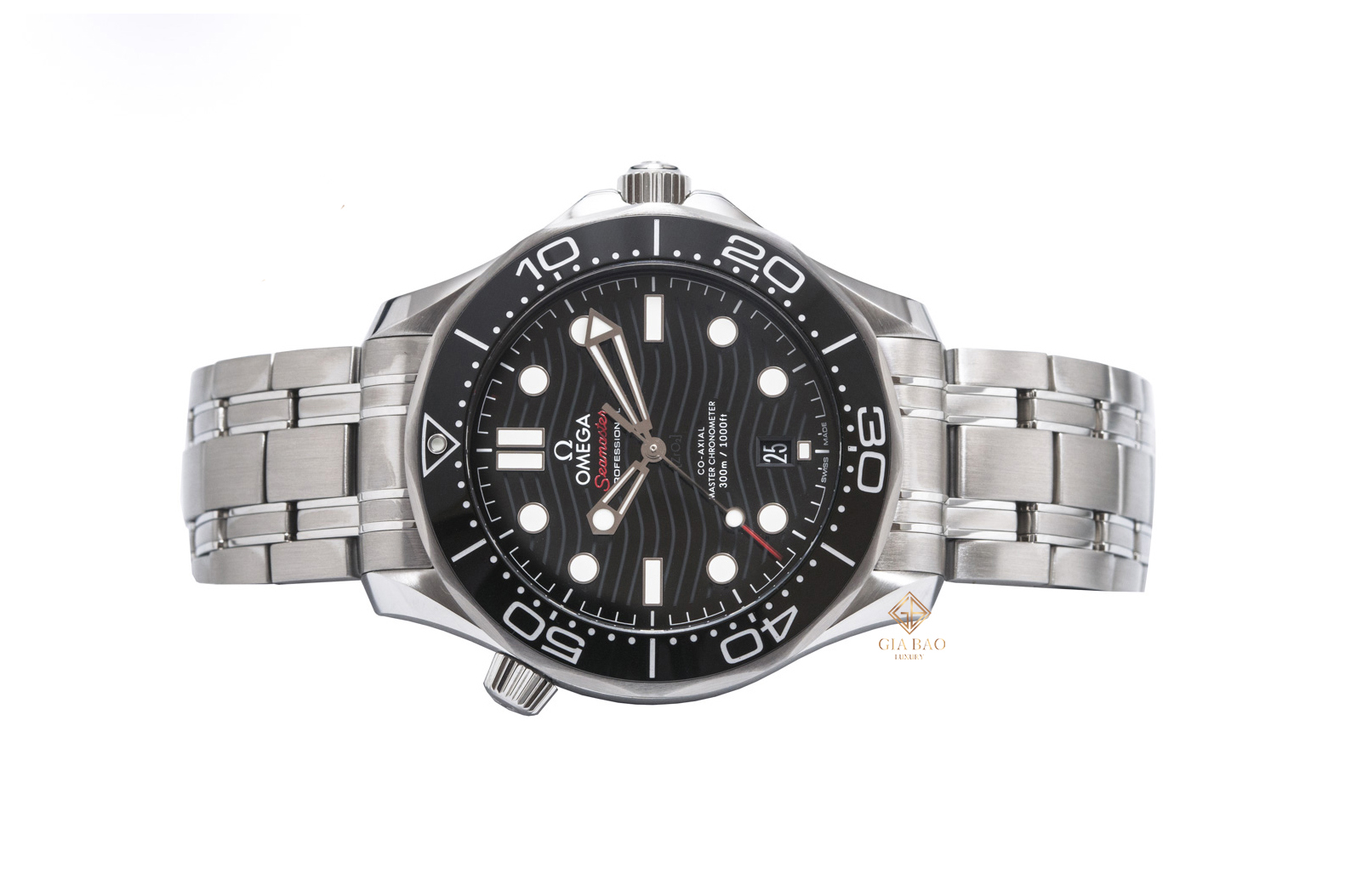 Mặt số chiếc đồng hồ Omega Seamaster Diver 300m Co-Axial Master Chronometer được thiết kế bởi những lượn sóng được khắc bằng tia laze thanh thoát, bắt mắt . Ô cửa sổ báo lịch ngày được đặt ở vị trí 6 giờ, trên góc 12 giờ là tên và logo thương hiệu Omega, đối diện phía bên dưới là chứng nhận “Master Chronometer” đảm bảo cho sự chuẩn mực về độ chính xác hoàn hảo của đồng hồ.