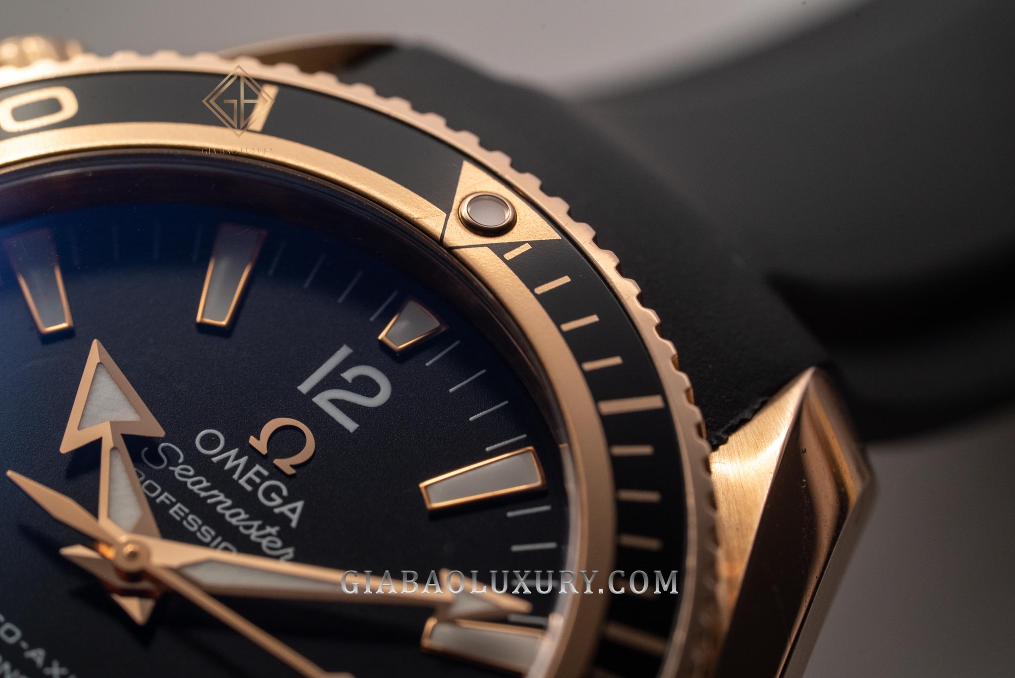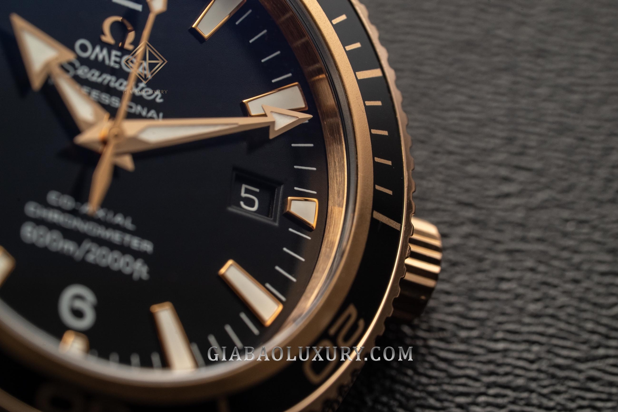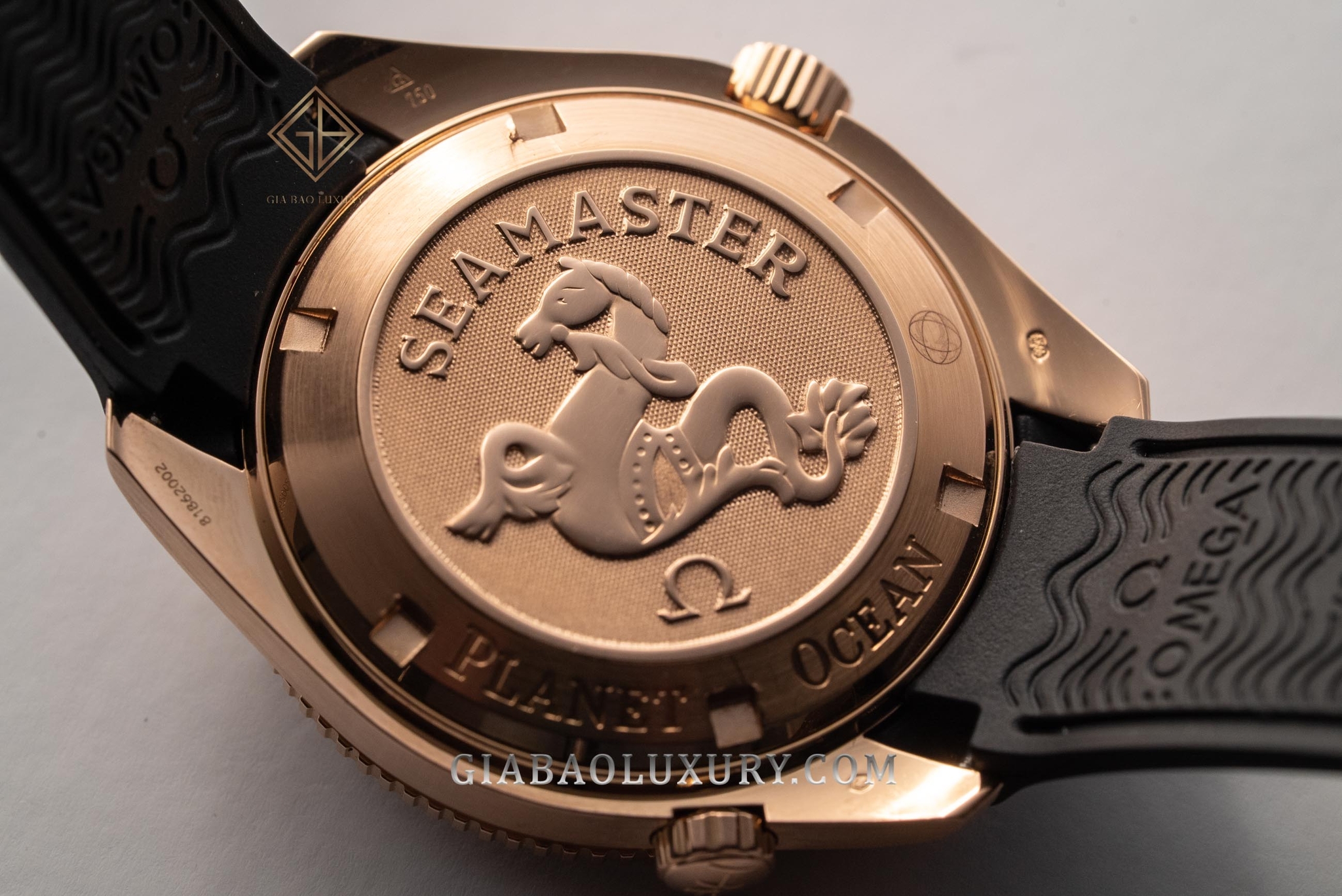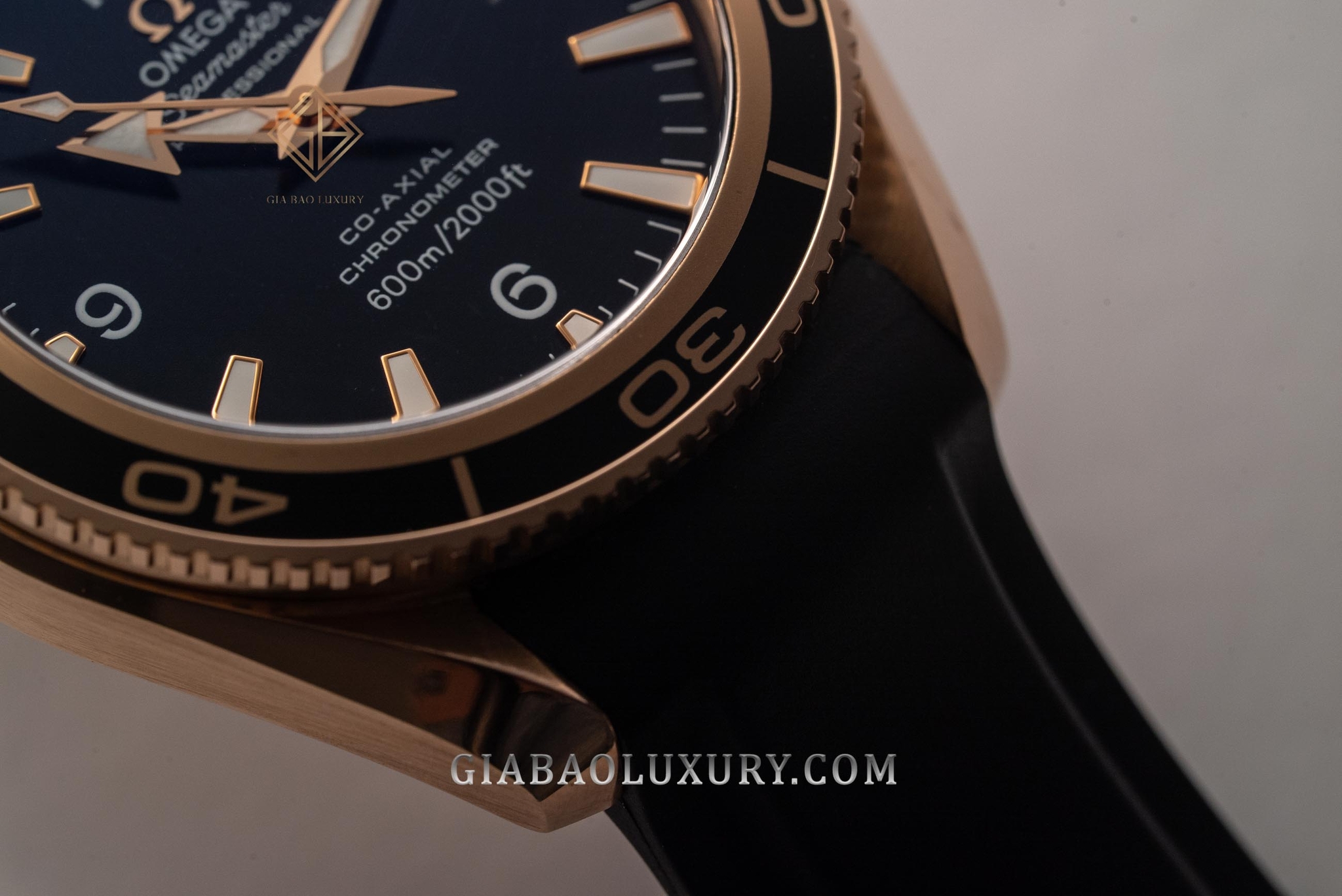 Thể thao và sang trọng, bộ vỏ đồng hồ kích thước 42mm x 14,5mm của Omega Planet Ocean hiện tại khá đầm tay nhờ chất liệu vàng hồng nguyên khối. Đi cùng thiết kế này là bộ dây đeo cao su màu đen khỏe khoắn. Nếu yêu thích sự thanh lịch, nhà sản xuất sẽ cung cấp cho quý khách hàng một bộ dây đeo da cá sấu riêng. Không chỉ sở hữu thiết kế thanh lịch, Planet Ocean vẫn mang đậm dấu ấn biển khơi khi có thể kháng nước ở mức 600m.