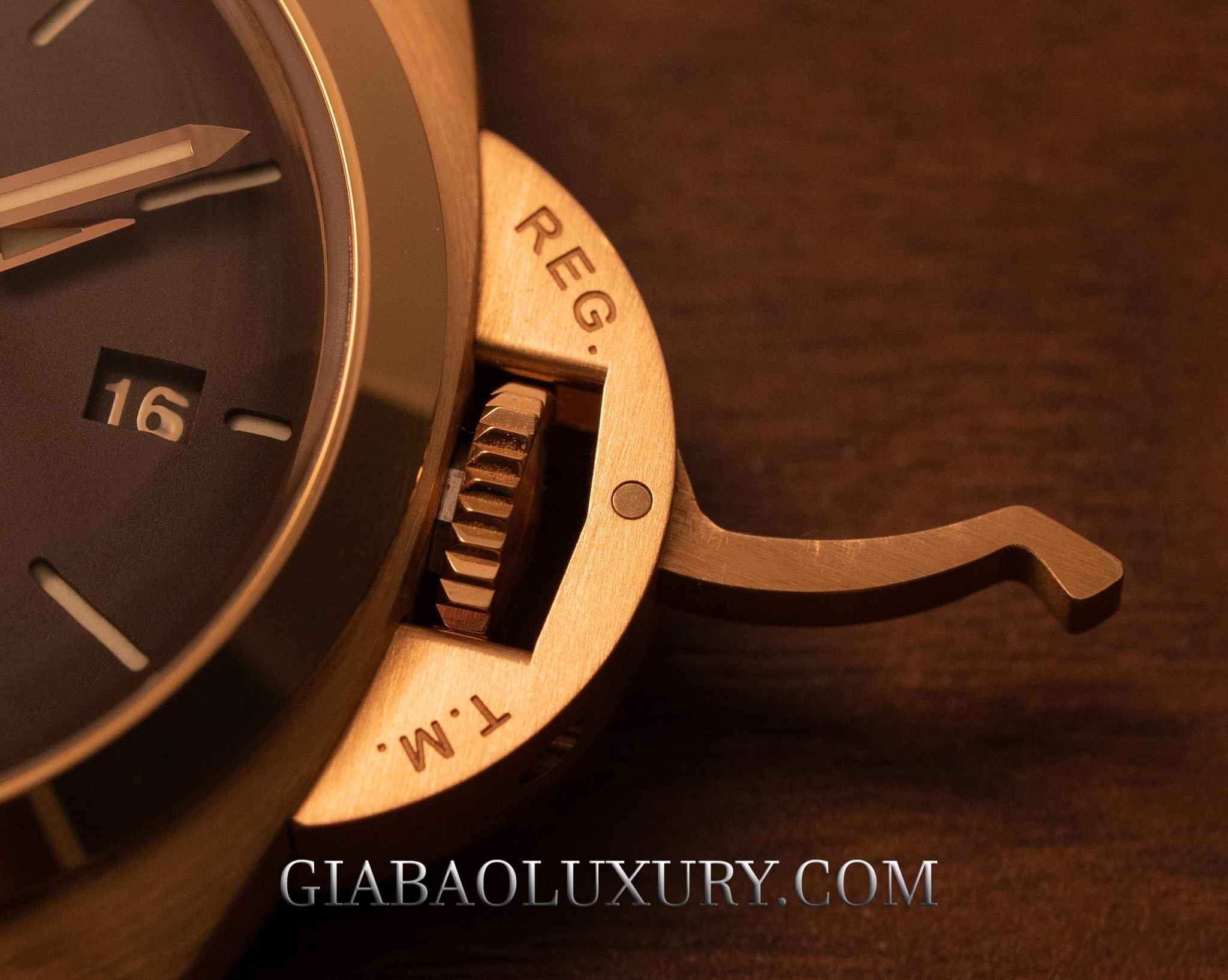 Vành bezel tròn trên dáng vỏ vuông có vát gọn lại về mỗi cạnh. Các bạn có thể thấy núm chỉnh giờ rất đặc biệt, theo Panerai thì vị trí núm là điểm yếu nhất của một chiếc đồng hồ lặn vậy nên hãng đã thiết kế một bộ khung tròn bao trọn vị trí núm. Chắc cốp hơn nữa là hãng đã làm thêm một chốt khóa núm, khi đóng chốt bạn không thể tháo núm để điều chỉnh giờ.