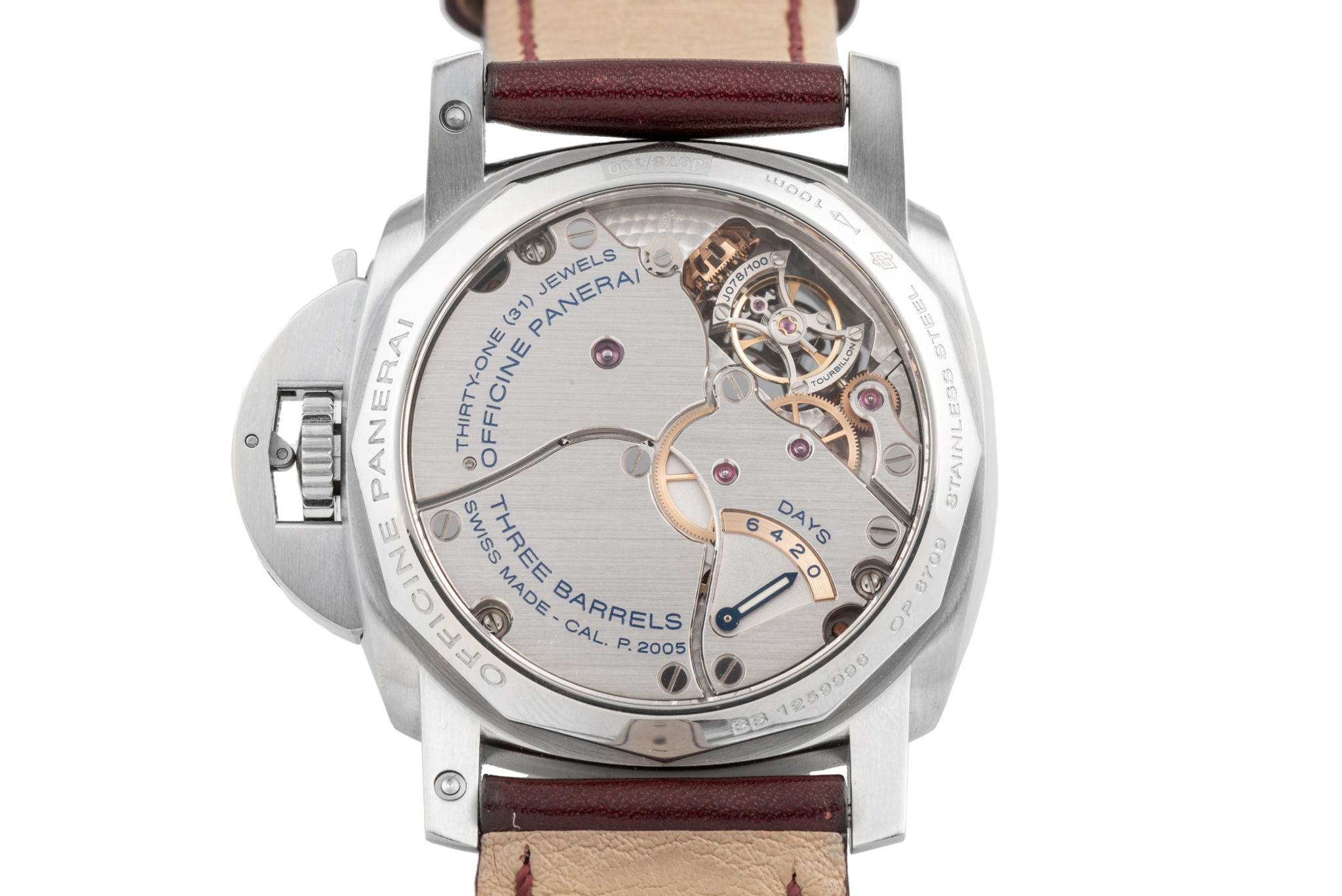 Tại vị trí số 649 của phiên đấu giá Antiquorum là một thiết kế đến từ thương hiệu Panerai, hay còn được gọi với biệt danh PAM. Mẫu đồng hồ Panerai Luminor 1950 Tourbillon GMT PAM 00276 / OP 6709 được sản xuất vào khoảng năm 2013, với những chi tiết quen thuộc đã làm nên tên tuổi của Panerai.