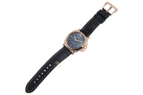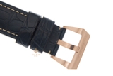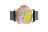 Để trung hòa sắc màu ấm nóng của bộ vỏ, Panerai sử dụng tông màu xanh lam trên cả mặt số và dây đeo. Sợi dây được làm dày dặn đúng theo phong cách của thương hiệu, được chế tác từ chất liệu da cá sấu tự nhiên, lót bằng lớp da bê mềm mại. Tất nhiên, người dùng sẽ được khuyến khích mua thêm dây để đa dạng hóa trải nghiệm đeo đồng hồ. Đặc biệt, điều này hết sức phù hợp với việc tháo lắp dễ dàng của dòng Panerai.