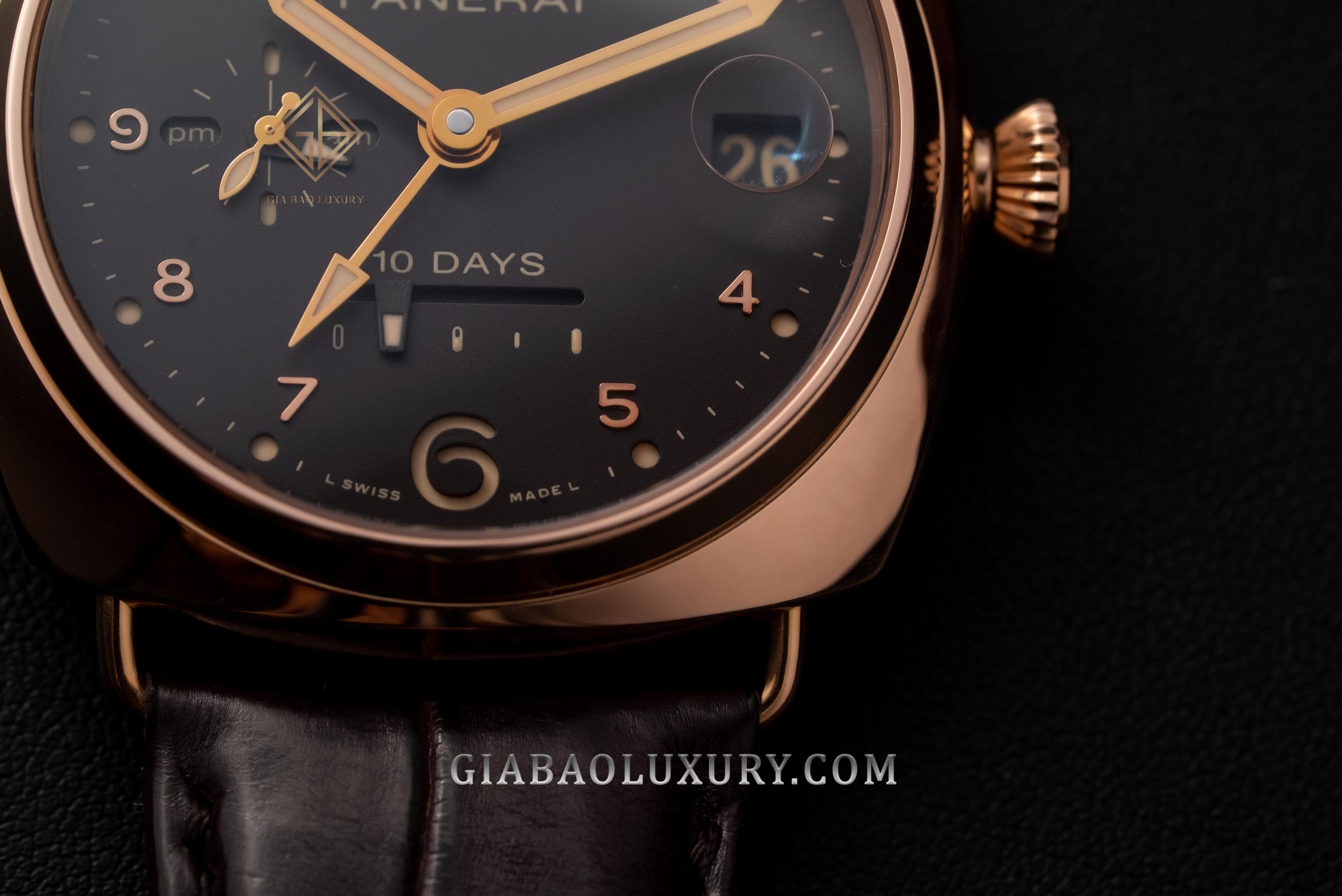 Mẫu đồng hồ Panerai Radiomir 10 Days GMT Oro Rosso sở hữu một mặt số có nhiều chi tiết bên trên, và nếu quen với đồng hồ, bạn sẽ không khó để nhận diện các chức năng được báo trên mặt số đồng hồ. Chạy đều ngoài viền mặt số là 11 cọc chỉ giờ bằng số Ả Rập, nằm tại cọc 3 giờ là cửa sổ báo ngày nền đen. Cũng có mặt trên mặt số tròn là bộ hiển thị thời lượng cót nằm giữa ổ trục kim và cọc chỉ 6 giờ đồng hồ.