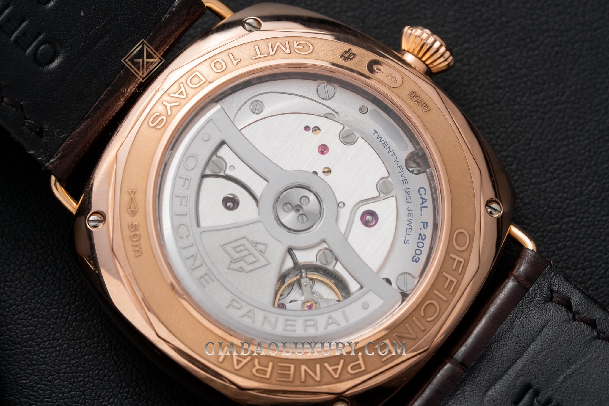 Panerai Radiomir 10 Days GMT Oro Rosso Automatic PAM00497 là một con chiến mã dài hơi có thể vận hành chính xác và bền bỉ trong suốt 10 ngày liên tiếp. Ngay trên mặt số đồng hồ chúng ta cũng có thể thấy được con số “10 days” in rõ nét với màu vàng bên trên. Để làm được điều đó, thương hiệu Panerai đã trang bị cho mẫu đồng hồ này bộ máy P.2003. Bộ máy tự động này khá kín đáo và nhìn thật giản dị, điều người yêu đồng hồ dễ dàng nhìn thấy khi quay ngược mẫu đồng hồ Panerai Radiomir này lại.
