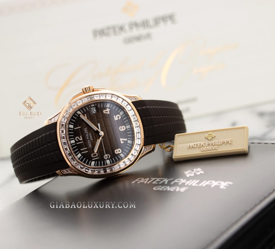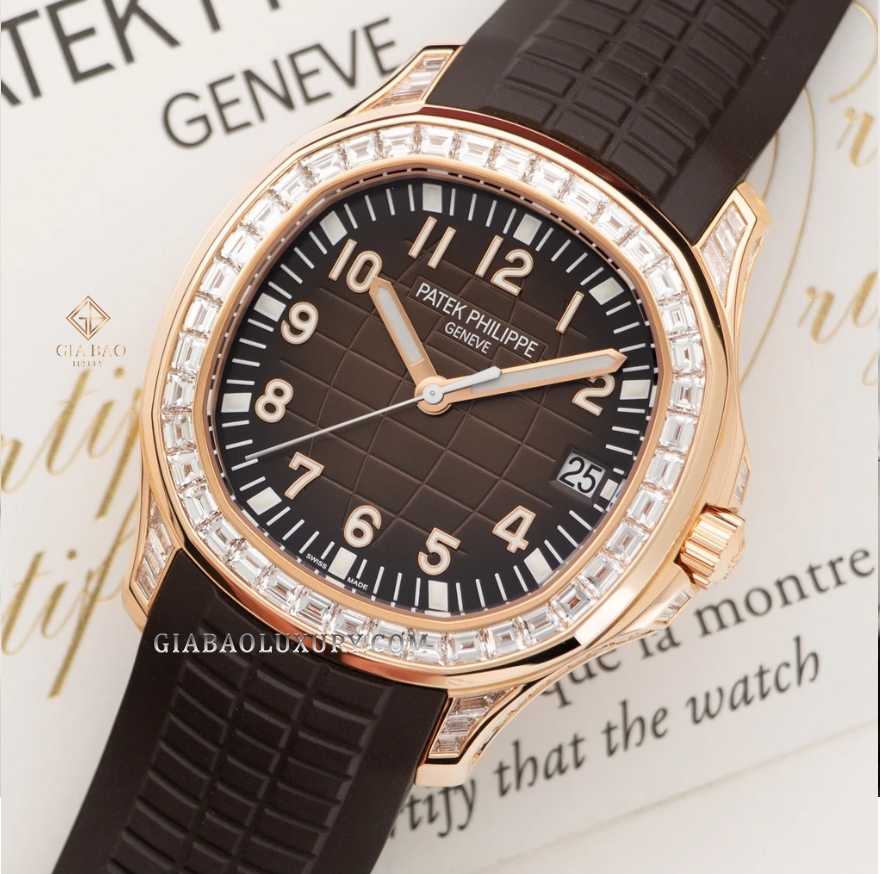 Thiết kế vỏ của Aquanaut không phức tạp và nhiều tầng lớp như Nautilus, nhưng vẫn giữ được dáng Cushion bo góc quen thuộc. Như đã nói ở trên, bộ vỏ vàng hồng 40.8mm của chiếc đồng hồ được làm đặc biệt hơn với những viên kim cương ống, gắn trên cả vành bezel và càng nối dây.