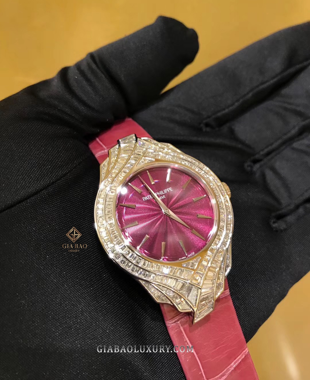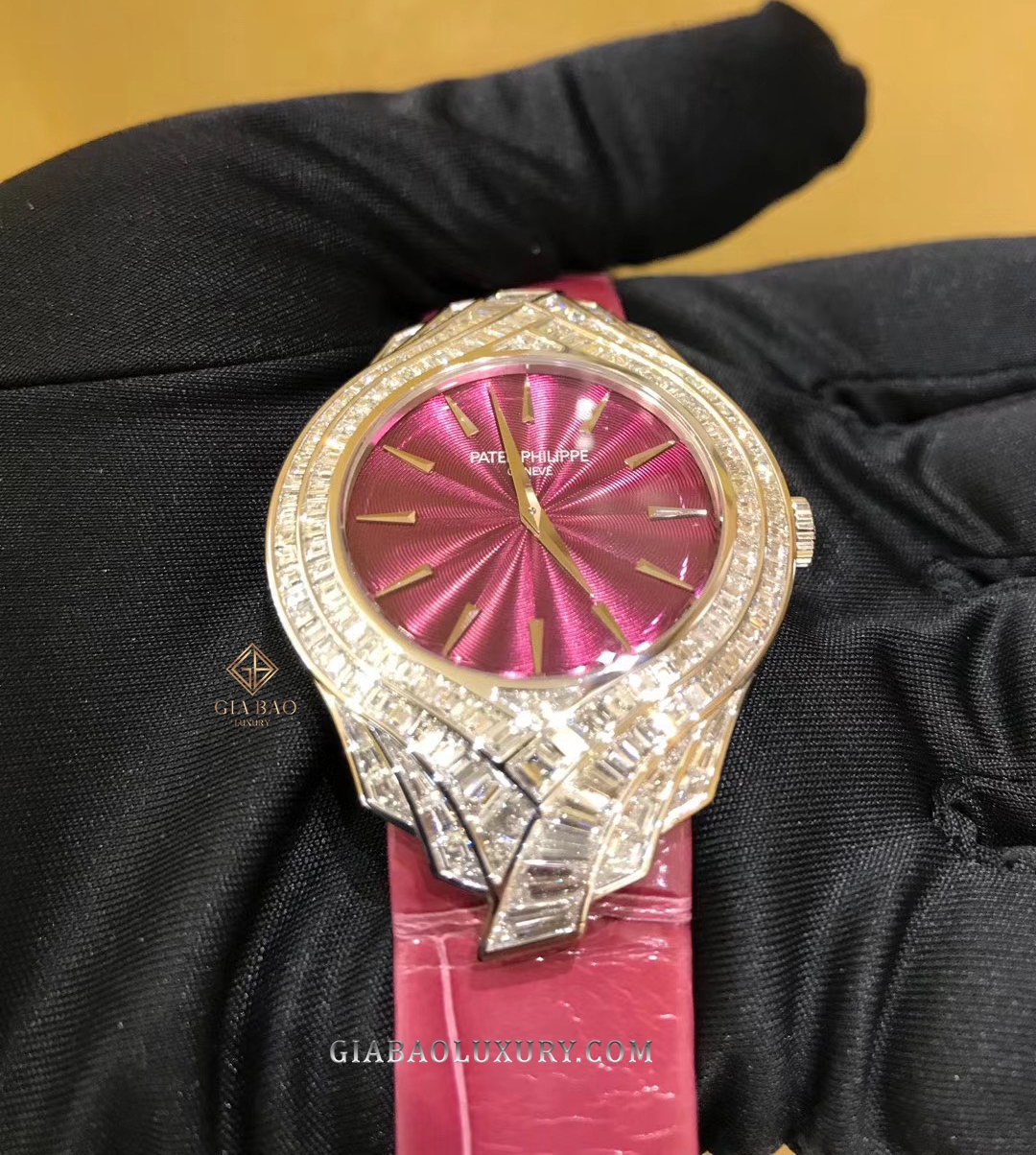 162 viên kim cương Baguette trên chiếc Patek Philippe Calatrava 4895G-001 không hề có chung kích thước, mà mỗi viên đều được cân đo đong đếm sao cho phù hợp với từng vị trí trên vỏ đồng hồ. Vì thế, bạn có thể thấy được những đường cong mềm mại theo từng họa tiết, tất cả đều được hoàn thiện cực kỳ tinh xảo.