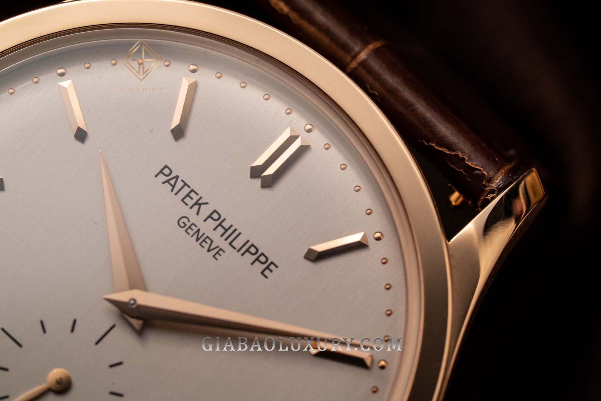 Thực sự đơn giản, đó là điều đầu tiên nếu chỉ nhìn vào mặt số của mẫu đồng hồ Patek Philippe Calatrava 5196R hiện tại. Nhưng không, bộ vỏ tròn sáng bóng, càng nối dây vát chéo tạo nên màu riêng biệt cho dòng đồng hồ Calatrava, nhất là khi kết hợp với mặt số chải xước dọc màu bạc với cọc chỉ giờ đính nổi trên mặt số. 12 vị trí cọc chỉ giờ trên mẫu Calatrava 5196R đều được hoàn thiện thủ công với khả năng bắt sáng hấp dẫn nhất. Patek Philippe tiếp tục thể hiện sự chăm chút của mình tới những chấm tròn đếm phút ngoài rìa mặt số. Những chấm siêu nhỏ nhưng tất thảy đều được đánh bóng, và thật may mắn, ống kính macro của Gia Bảo Luxury đã ghi lại điểm tuyệt vời ấy.