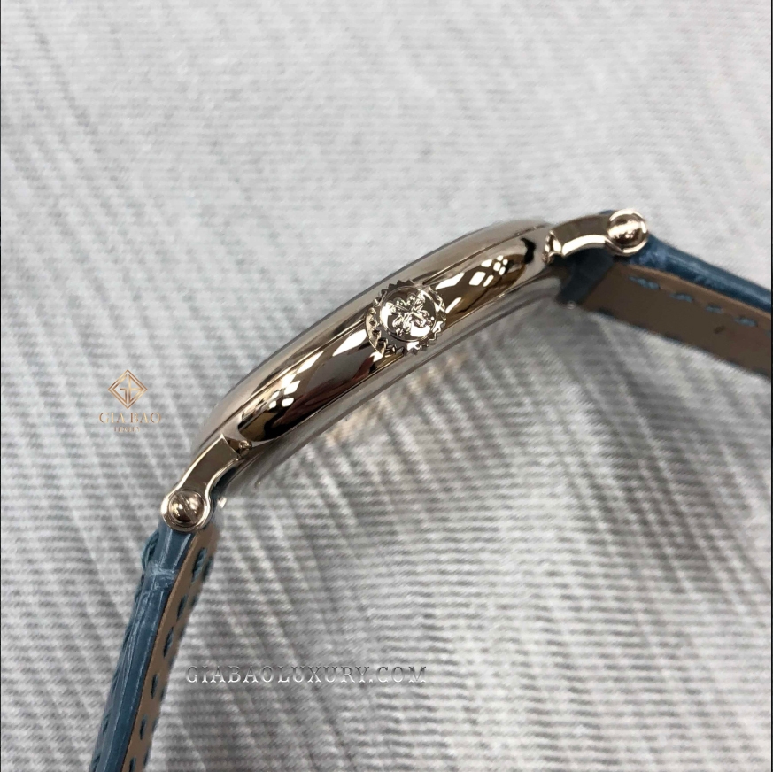 Bộ vỏ vàng trắng được thiết kế nhỏ gọn với đường kính 34.6mm và bề mặt đánh bóng đơn giản nhưng tinh tế. Để thực hiện được những đường cong mềm mại trên vỏ đồng hồ, những người nghệ nhân đã phải xử lý từng chi tiết nhỏ bằng tay, với những công cụ chuyên dụng. Phần tai càng nối dây được thiết kế theo phong cách truyền thống (dài và mảnh), giúp cố định sợi dây bằng hai chiếc đinh vít.