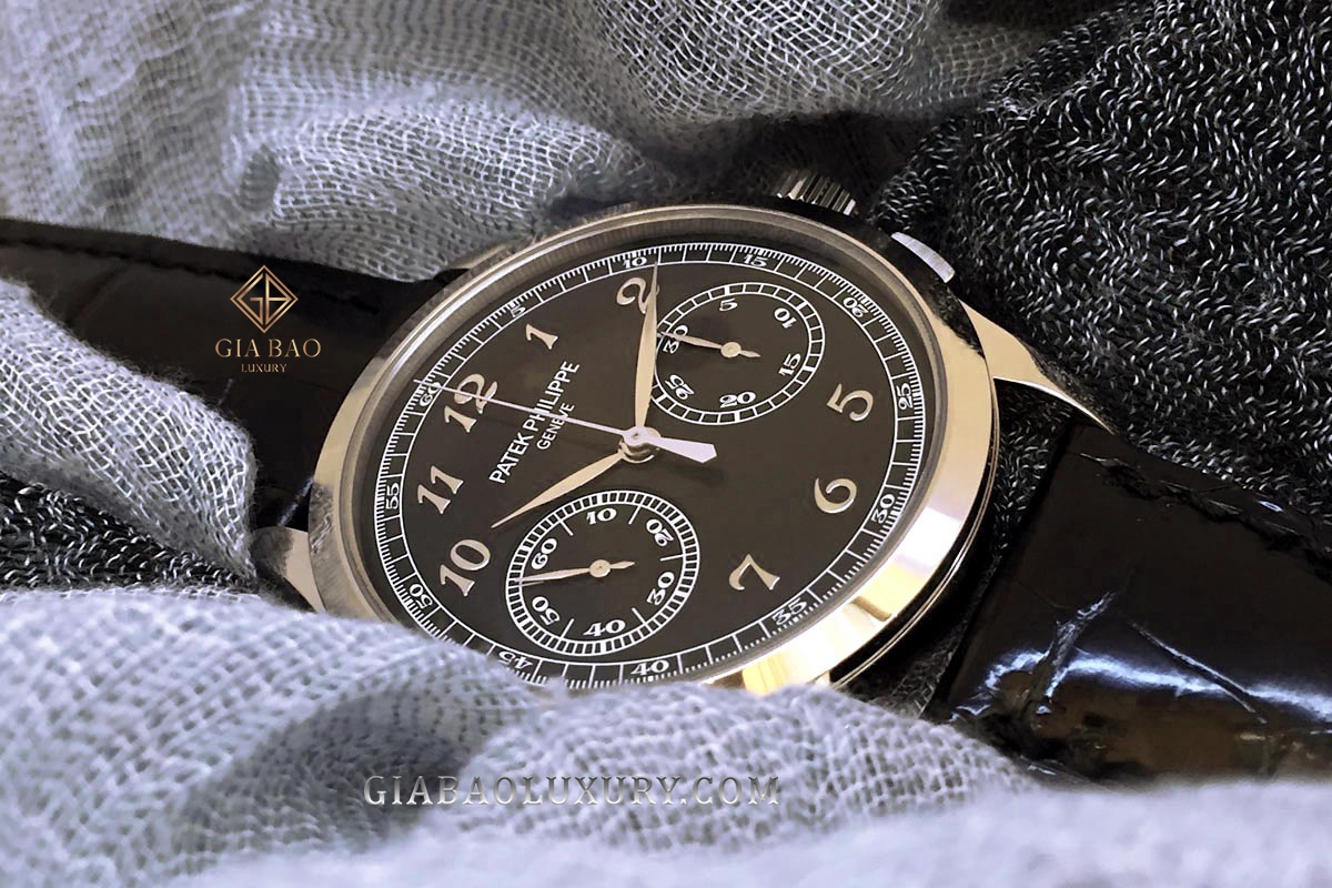 Mặt số đồng hồ được thiết kế đơn sắc với tông nền đen, đi kèm những chỉ báo màu trắng. Bộ cọc số được chế tác từ vàng trắng và thiết kế theo phong cách Breguet với những đường uốn lượn đặc trưng. Ở rìa ngoài mặt số là thang chỉ phút đồng thời cũng có nhiệm vụ đo giây bấm giờ, giúp người dùng dễ dàng quan sát và đo đếm thời gian chính xác tới từng giây.