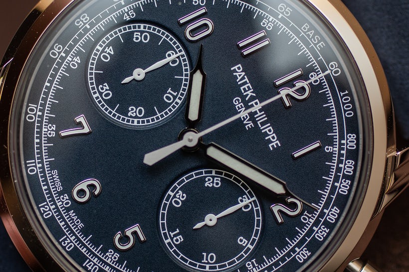 Như đã nói ở trên, mặt số của chiếc 5172G-001 được hoàn thiện với một màu xanh tuyệt đẹp, kết hợp với bộ cọc số Ả Rập được phủ chất phát quang. Giống với thiết kế vỏ ngoài, bộ kim hình xi-lanh cũng khiến chúng ta liên tưởng tới những chiếc đồng hồ cổ điển.