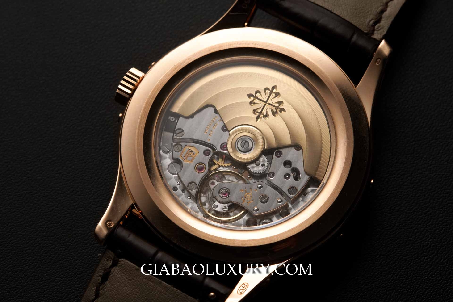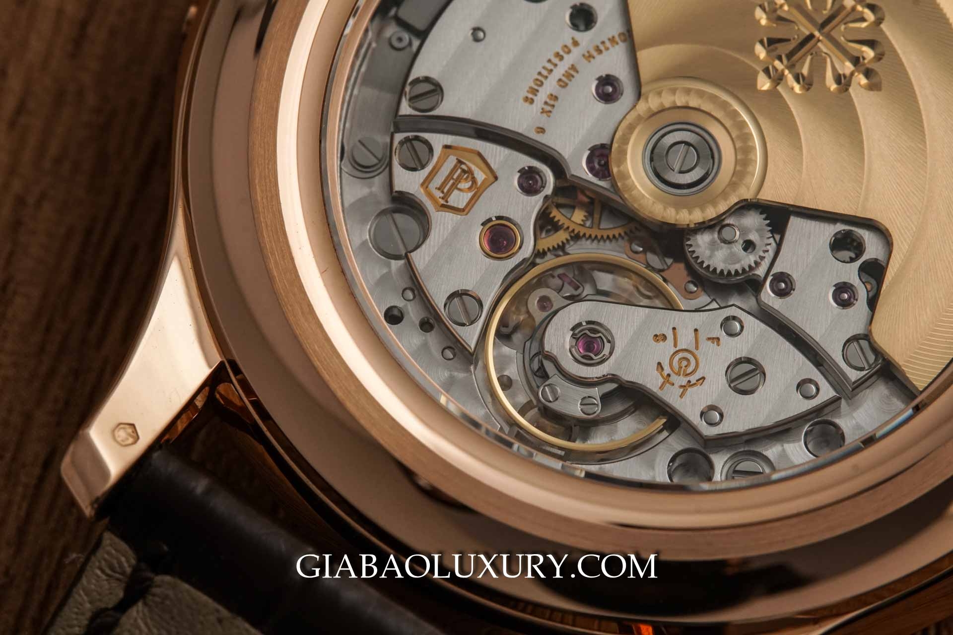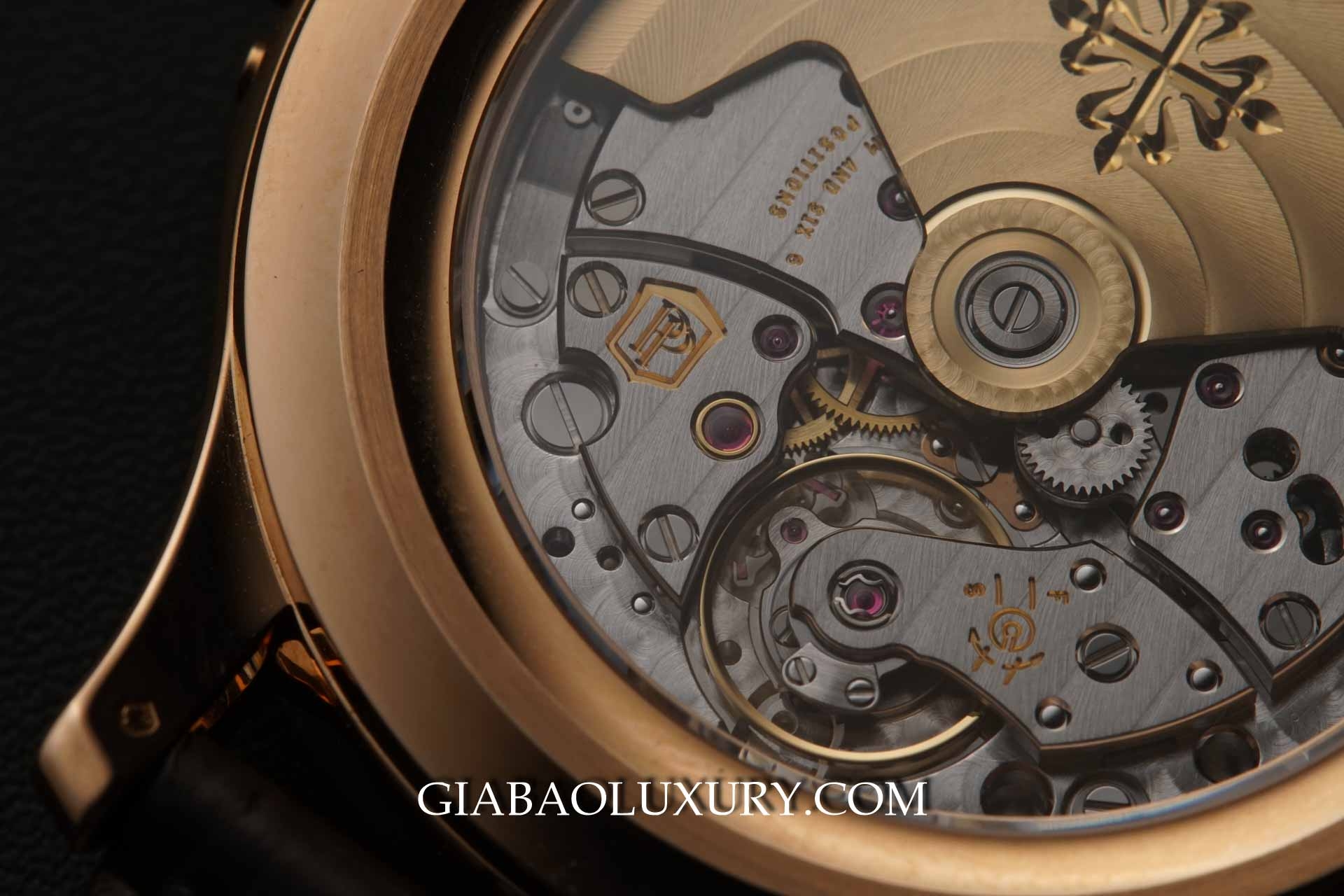 Với khối kinh nghiệm hơn 100 năm, những đại diện nhà Patek Philippe được trau chuốt tỉ mỉ không chỉ ở thiết kế có tỷ lệ cân xứng bên ngoài, mà cả từng chi tiết nhỏ gọn nằm ở bộ máy chuyển động bên trong. Bên dưới lớp kính sapphire trong suốt phía nắp lưng của cỗ máy Patek Philippe Annual Calendar 5205R-001 là bộ máy tự động 324 S QA LU 24 có tần số hoạt động là 4Hz. Gõ 28.800 nhịp/giờ, bộ máy 324 S QA LU 24H có thể cung cấp năng lượng cho cả chiếc đồng hồ vận hành trong vòng 45 giờ với một rotor bằng vàng kích thước lớn có dấu hoa thị rõ nét và chỉn chu bên trên.