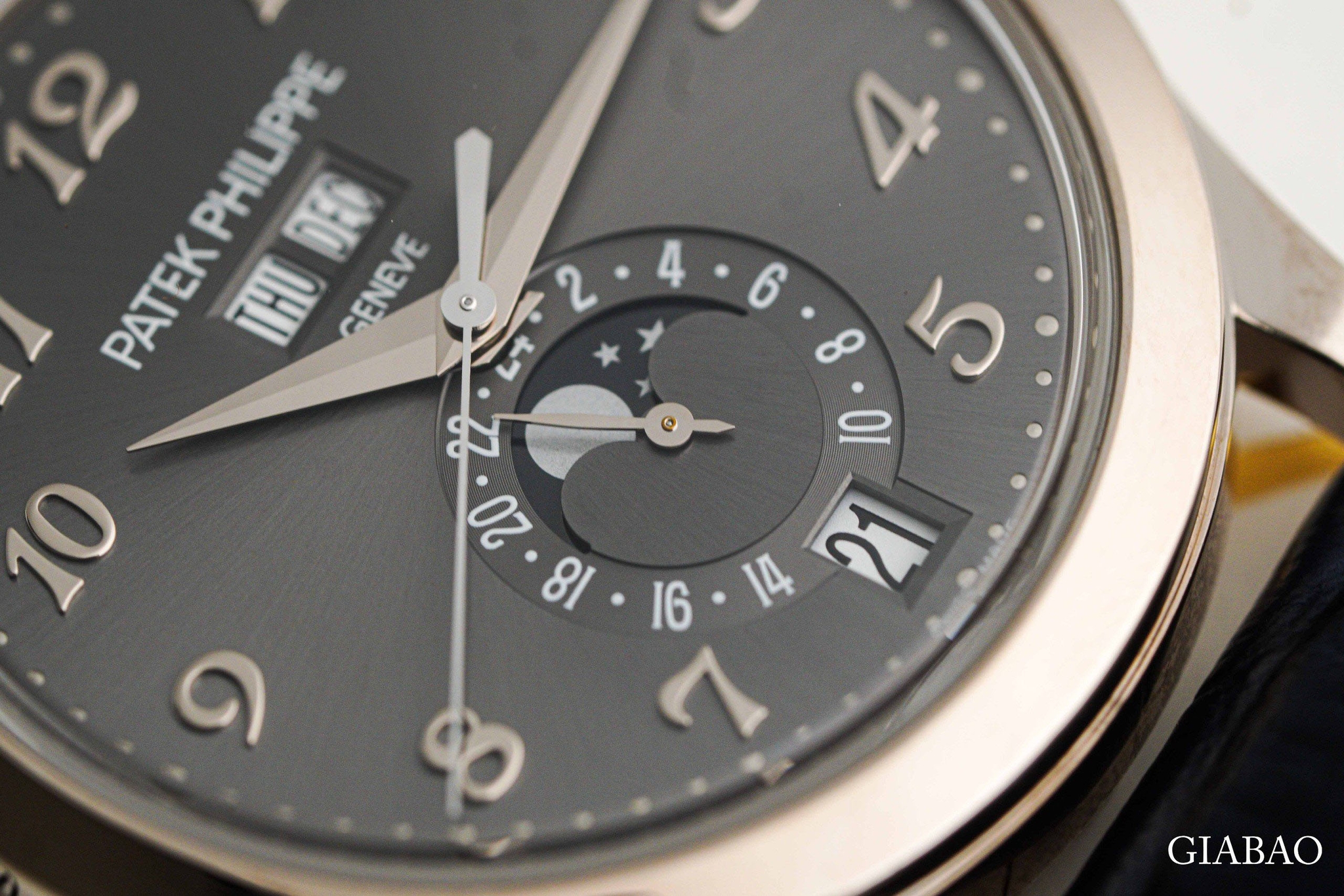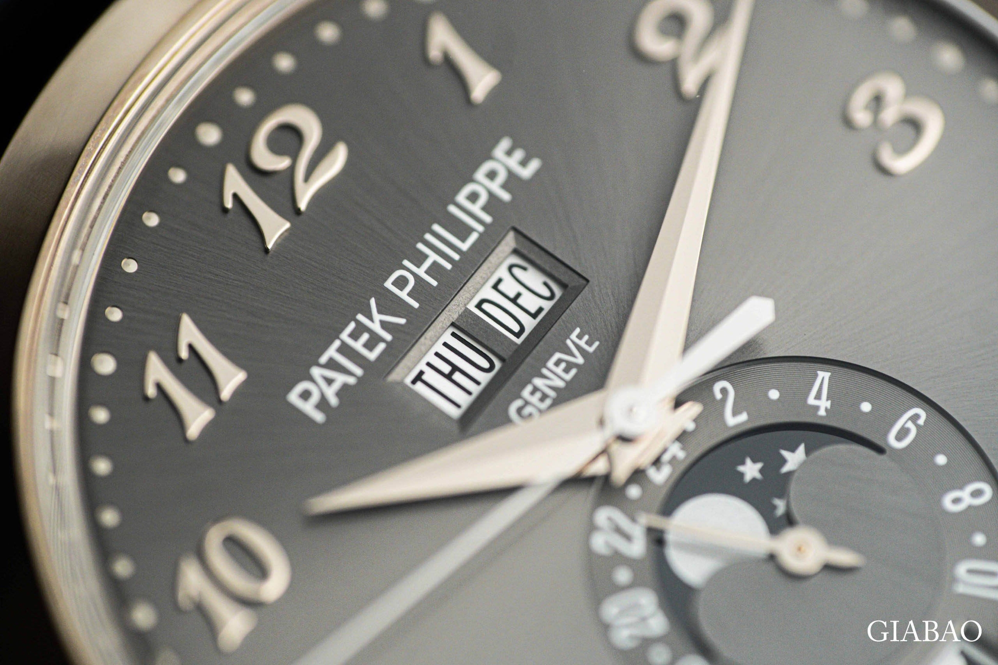 Đồng hồ ghi dấu ấn mạnh mẽ với người hâm mộ bởi mặt số được thiết kế và chế tạo tỉ mỉ. Nền mặt số được xử lý để cho màu xám than và có những đường chải tia, để kết quả cuối cùng là nó rất bắt sáng. Rất là cổ điển, các cọc chỉ giờ đặt phía ngoài là dạng số Breguet và tất cả đều từ vàng trắng. Ở rìa mặt số có 60 chấm tròn nhỏ cũng được đánh bóng toàn bộ. Là một trong những mẫu đồng hồ lịch thường niên được khách hàng tin tưởng nhất, Complications 5396G-014 thể hiện ưu thế của mình trong phần thiết kế và bố cục của mặt số.