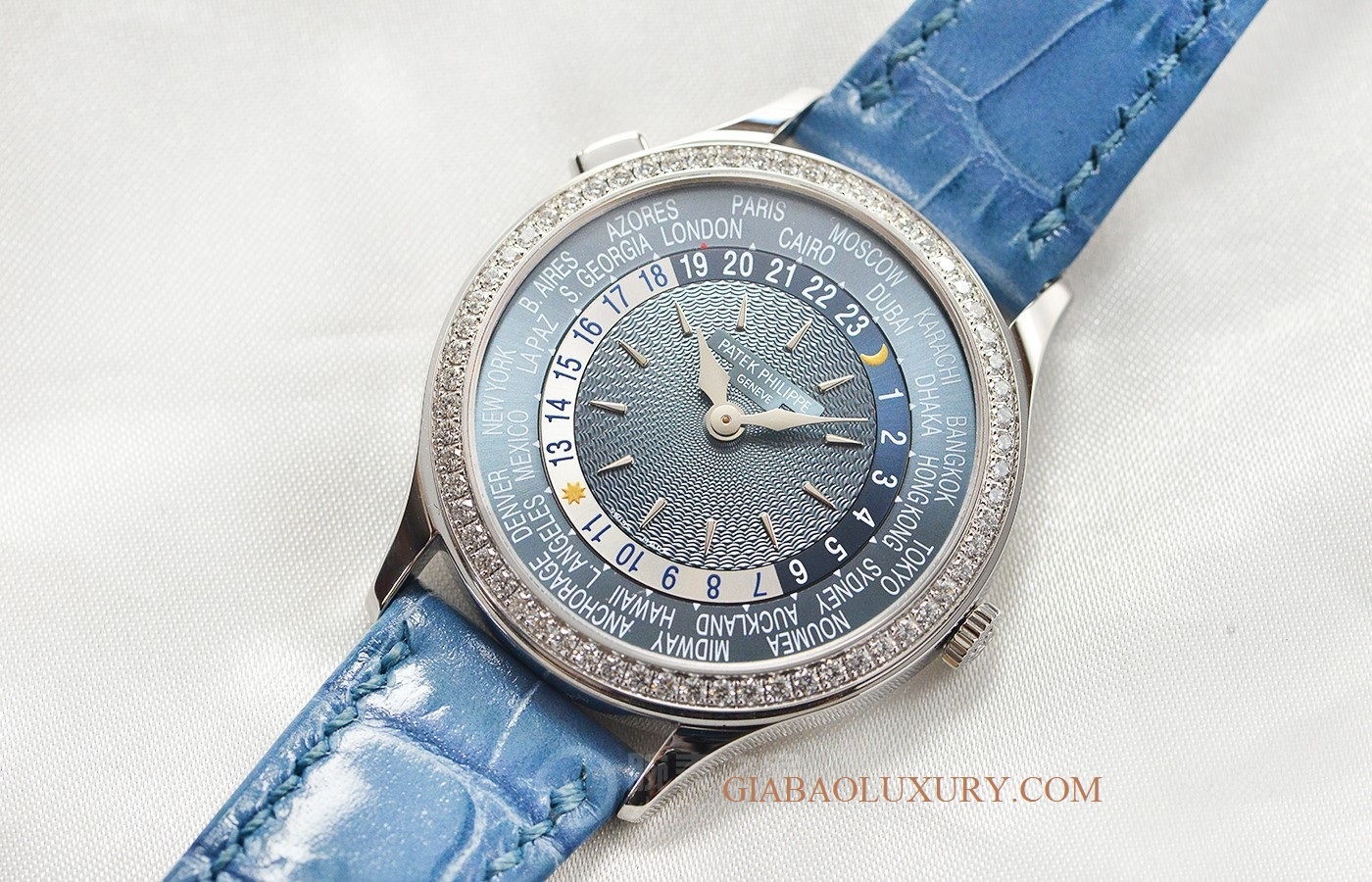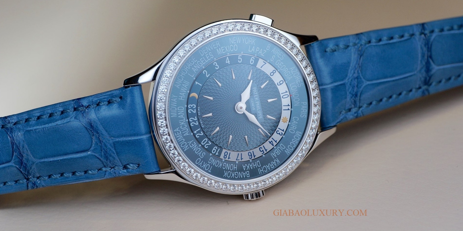 Một trong những sự lựa chọn tinh tế hướng đến những quý cô có gu cá tính, thường xuyên phải di chuyển giữa các mũi giờ hay có tính bao quát, phổ rộng, yêu thích màu xanh của đại dương thì không thể bỏ qua phiên bản Patek Philippe Complication Ladies World Time 7130G-014.