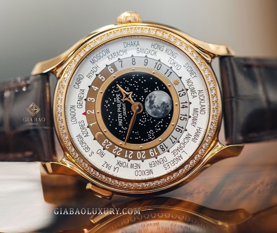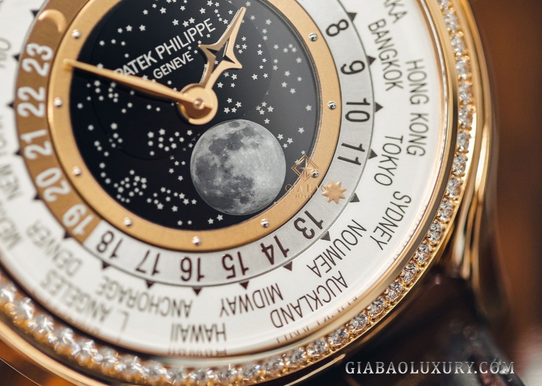 Bộ kim giờ phút cũng là một chi tiết khiến thiết kế này trở nên nổi bật hơn. Tôi đã thấy rất nhiều chiếc Patek Philippe World Time, nhưng chưa thấy thiết kế nào có cây kim giờ hình chữ thập như thế này cả. Những chi tiết khác thì vẫn giống với thiết kế World Time bình thường của Patek Philippe: vẫn là vòng xoay với tên 24 thành phố, vẫn là đĩa 24 giờ có nhiệm vụ hiển thị thời gian của từng múi giờ.