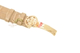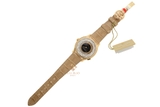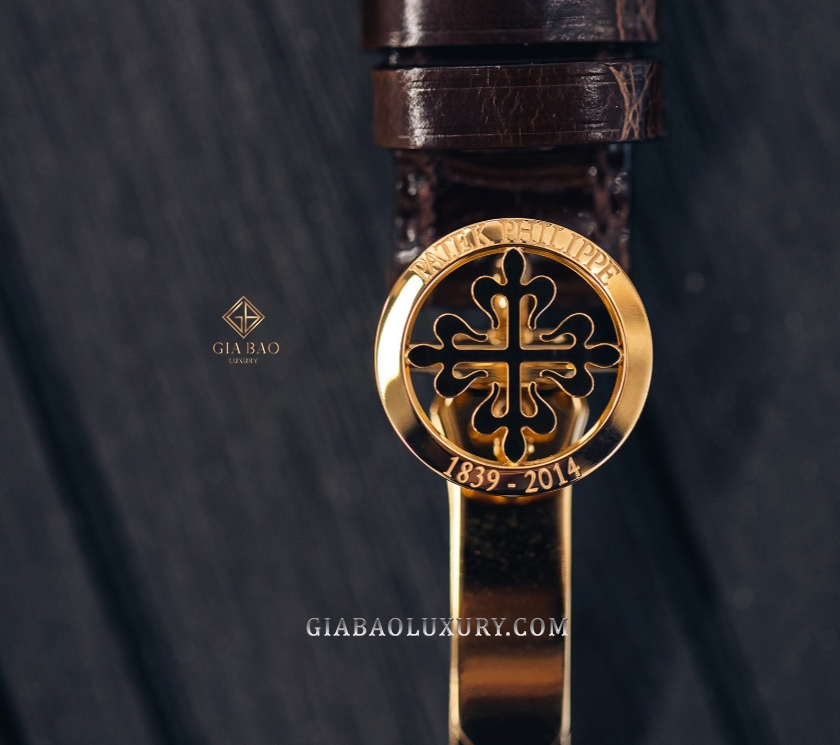 Đi kèm với bộ vỏ vàng hồng là bộ dây màu nâu nhạt, làm từ chất liệu da cá sấu. Tông màu nâu đất này rất ít khi được xuất hiện trên đồng hồ đeo tay, nhưng điều này lại đem lại cảm giác mới lạ và là trải nghiệm hoàn toàn khác biệt. Bộ dây da cá sấu cao cấp được cố định bởi khóa gập, trên đó chạm khắc logo thương hiệu hình hoa thị (hay chính xác hơn là thánh giá Calatrava).