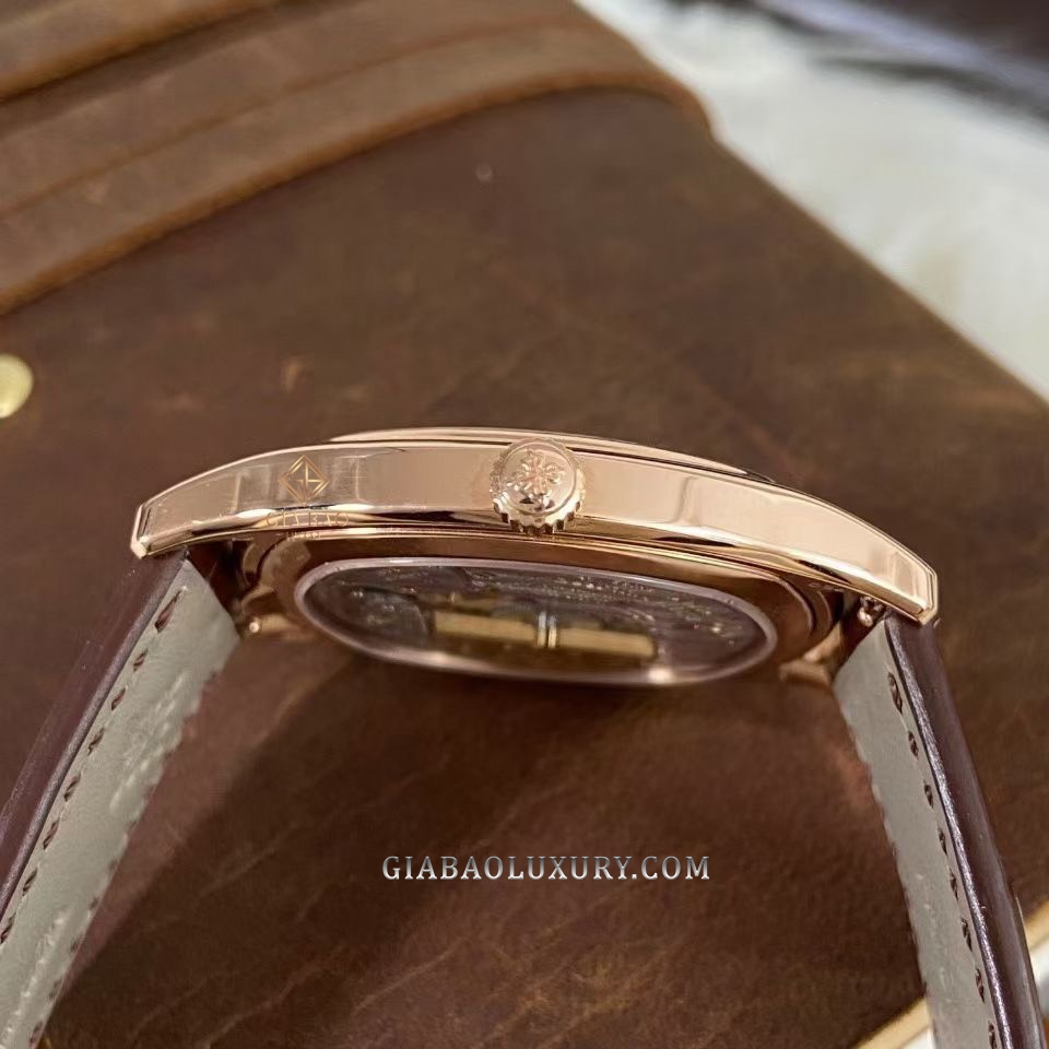 Patek Philippe 5940R-001 là một chiếc đồng hồ đẹp, đẹp ở mặt chức năng phức tạp và đẹp ở phần hoàn thiện tinh tế. Màu sắc cổ điển bao trùm thiết kế của mẫu đồng hồ. Ở đó, những cọc chỉ giờ đều dạng số Breguet bằng vàng hồng được đính nổi và được đặt bên trong những chấm chỉ phút nhỏ bé đã được hoàn thiện sáng bóng.