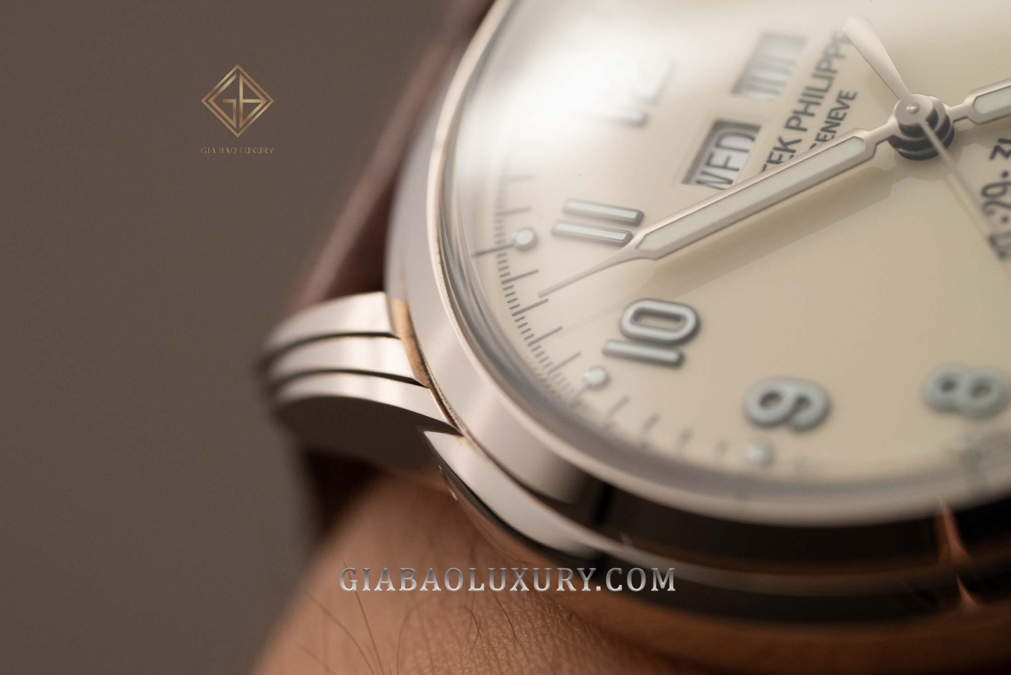 Ngoài 4 tai càng nối dây rất ấn tượng thì mặt số sơn mài (không phải men nung) màu trắng kem cũng làm tôi đặc biệt thích thú. Sở thích hơi cá nhân là tôi ưu ái những chiếc Patek mặt trắng, rất cổ điển và lịch thiệp. Trước đây tôi cũng đã review trực tiếp những chiếc đồng hồ lịch năm của Patek Philippe như 5205R, 5396R nhưng sắc trắng mặt số lại là trắng sữa Opaline. Chắc chắn chiếc đồng hồ này sẽ là mục tiêu sắp tới của Gia Bảo Luxury.