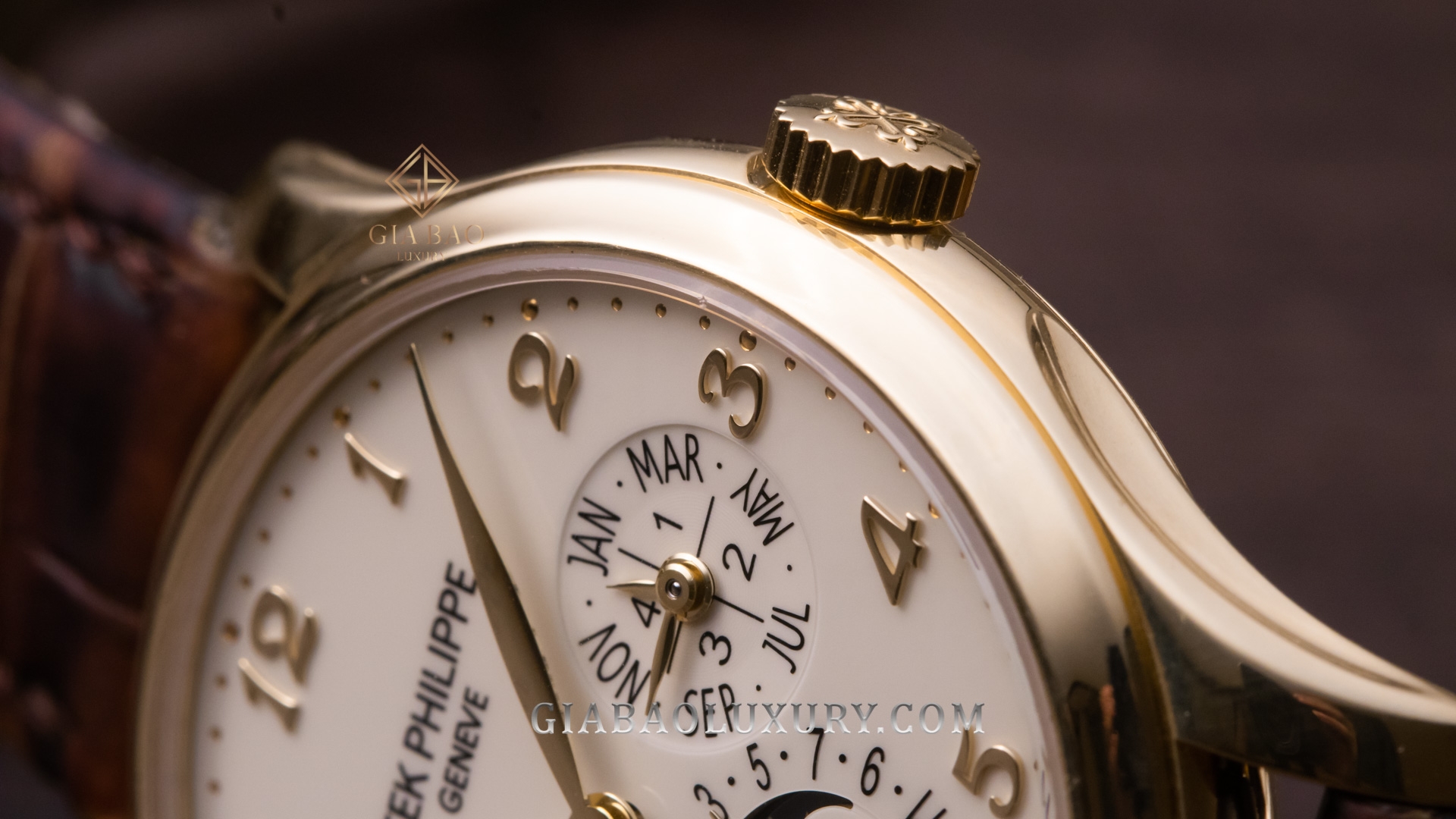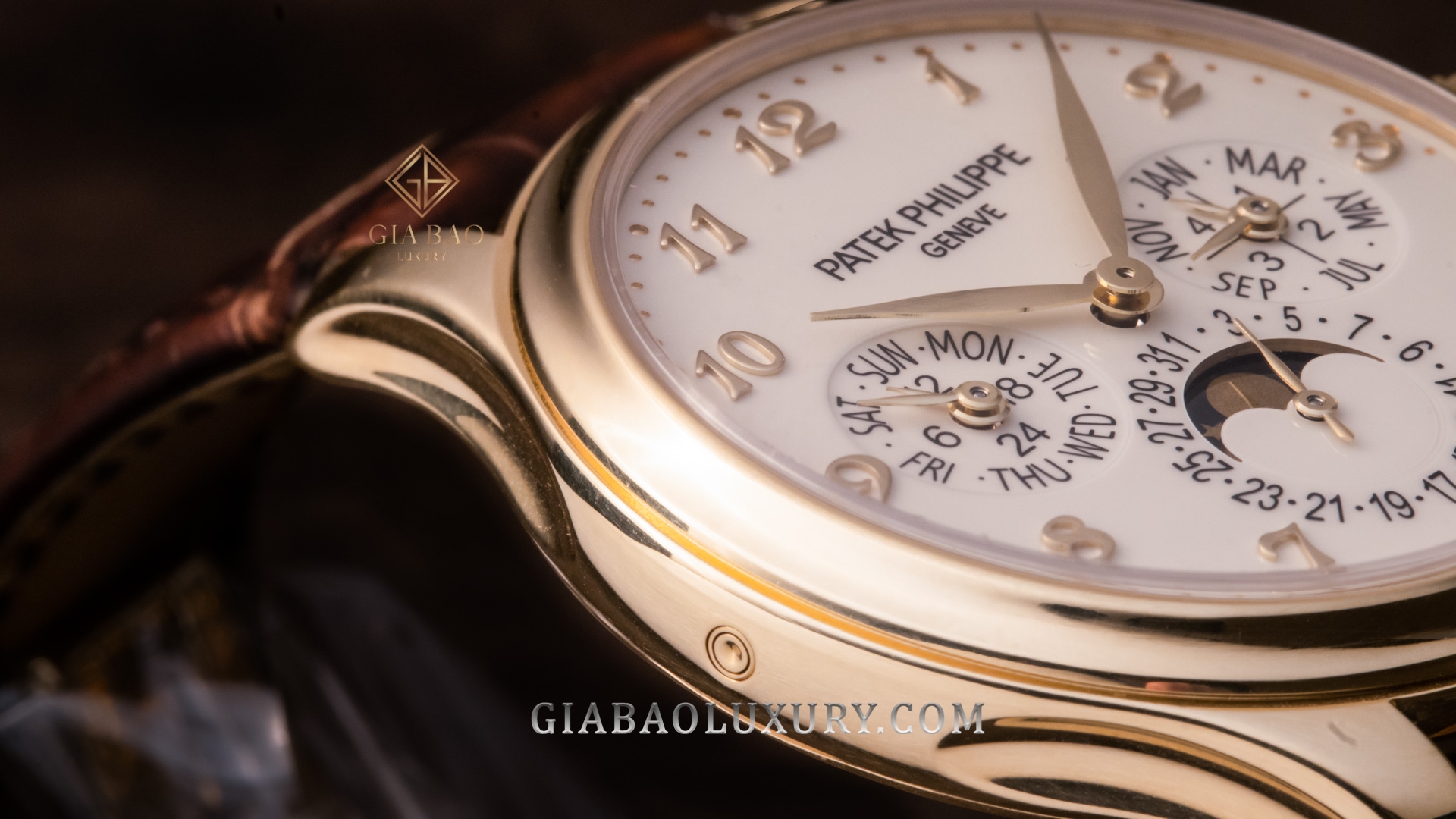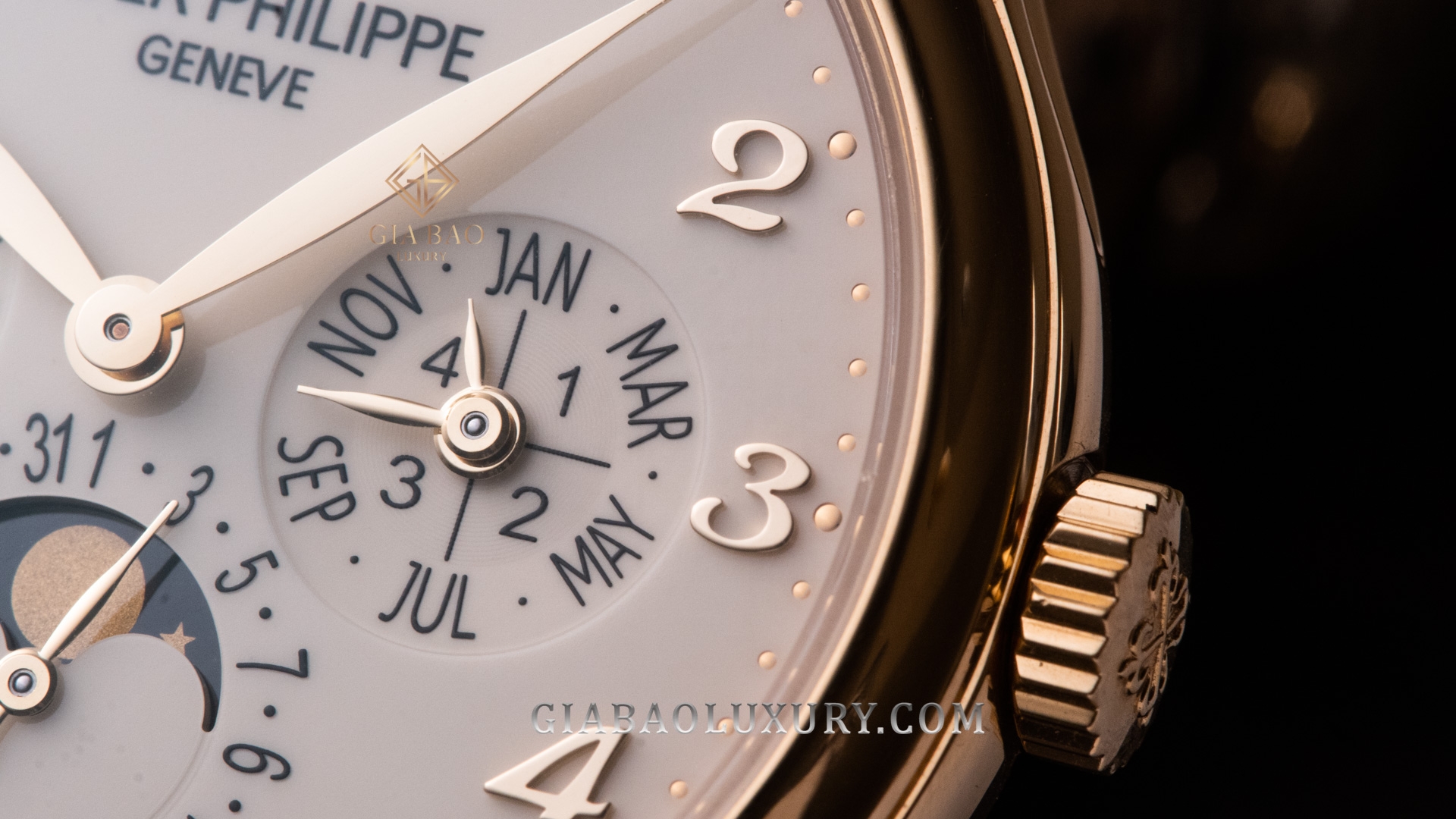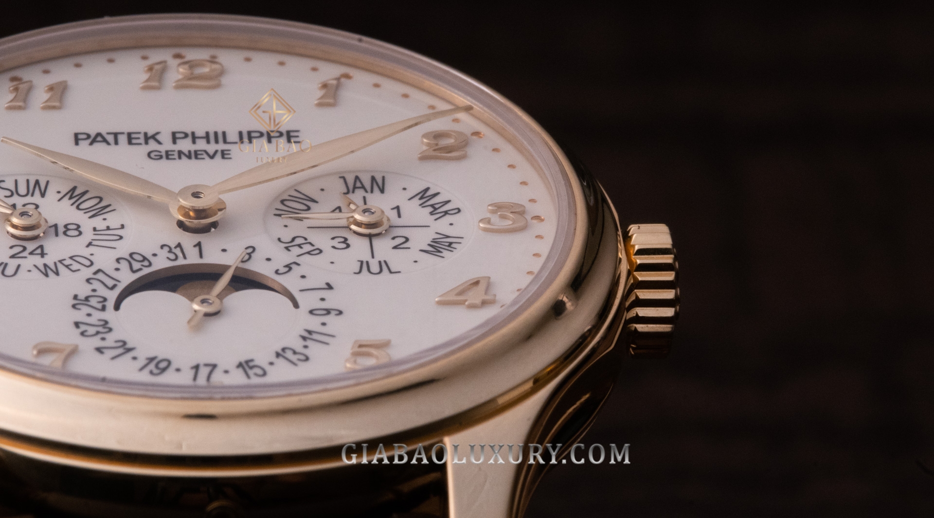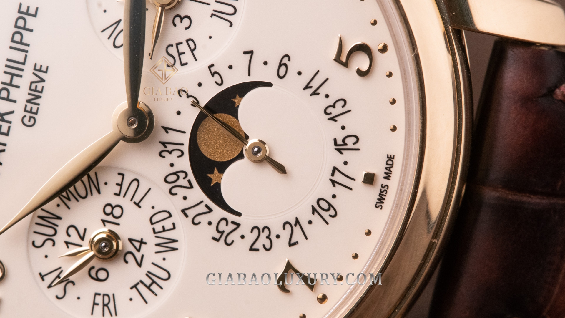 Lần lượt các mặt số ở góc 3/6/9 thể hiện tháng và năm nhuận/Lịch ngày và Lịch tuần trăng/Thứ và kim 24 giờ. Vì đây là một chiếc đồng hồ Lịch vạn niên, nên bạn sẽ không cần chỉnh lại ngày nếu chiếc đồng hồ này hoạt động liên tục. Đó thật sự là một điều may mắn vì việc chỉnh lại từng này thông số chắc chắn sẽ mất rất nhiều thời gian và công sức.