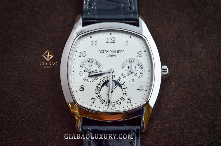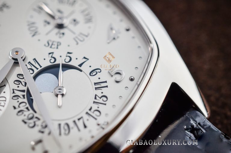 Như đã nói ở trên, điểm đặc biệt của chiếc Patek Philippe Grand Complications 5940G-001 nằm ở bộ vỏ dáng Tonneau, với các góc cạnh được bo tròn mềm mại. Toàn bộ vỏ đồng hồ được làm từ vàng trắng nguyên khối, được đánh bóng thủ công như một tấm gương bạc với cả năng bắt sáng hoàn hảo.