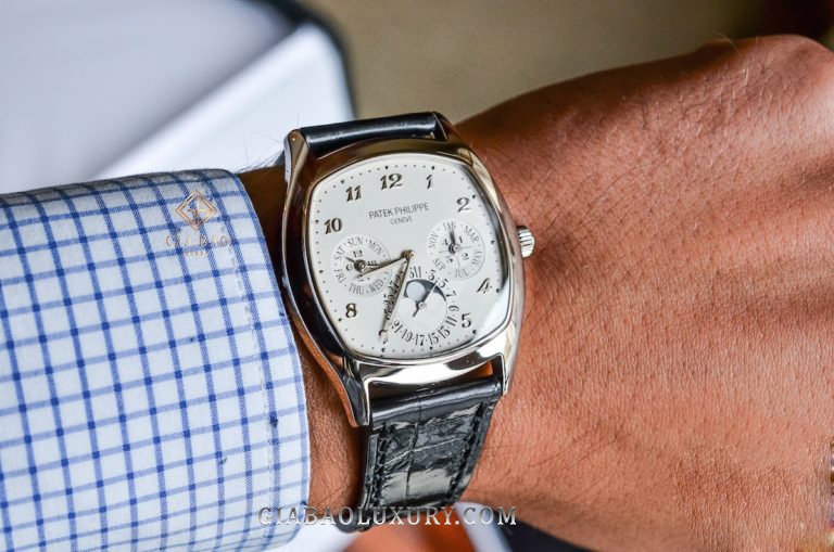 Với kích thước bề ngang 37mm và bề dọc 44.6mm, mẫu Patek Philippe Grand Complications 5940G-001 có thể dễ dàng trượt vào tay áo sơ mi, hoàn toàn phù hợp với những buổi tiệc sang trọng. Bộ vỏ vàng trắng được ra đời nhằm phục vụ những người thích trải nghiệm cao cấp, nhưng lại phải đi kèm với sự kín đáo nhất định. Chất liệu này không quá nổi bật như vàng vàng, nhưng lại có độ đầm tay khác biệt hoàn toàn so với đồng hồ thép.