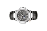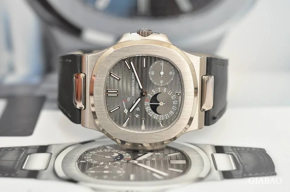 Chiếc Patek Philippe Nautilus 5712G-001 mang một tông màu đơn sắc thanh lịch, dành cho những người không muốn phô trương. Mặt số xám tro được chế tác tuyệt hảo, với những tính năng tiện dụng như Lịch ngày, Lịch tuần trăng và Bộ hiển thị thời lượng cót. Bộ kim và cọc số cũng được phủ chất phát quang, giúp người dùng có thể dễ dàng quan sát thời gian trong bóng tối.