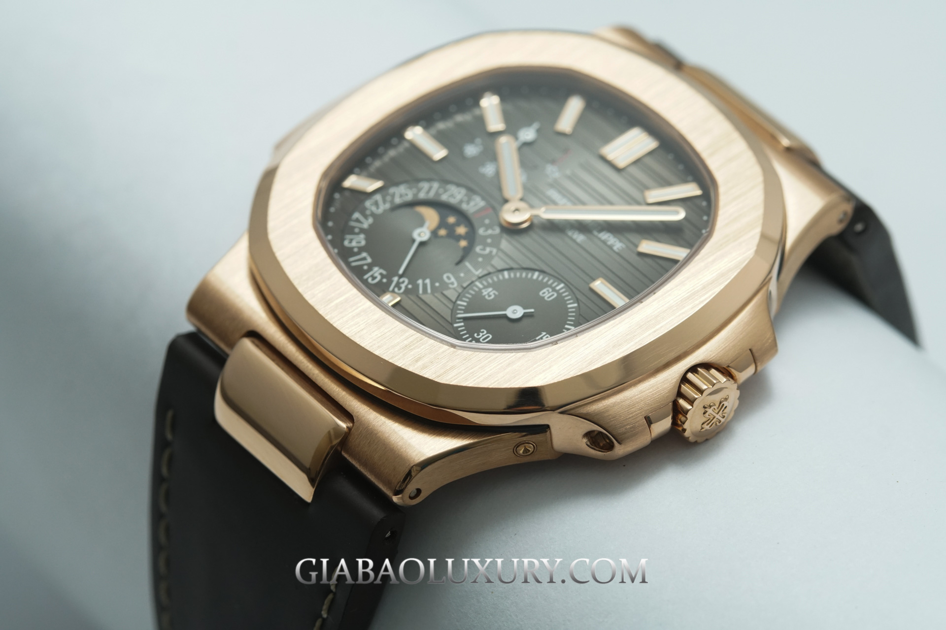 Với đồng hồ, sự kết hợp giữa mặt số nâu và bộ vỏ vàng hồng gần như đã trở thành tiêu chuẩn, và mẫu đồng hồ Patek Philippe Nautilus 5712R-001 cũng được thiết kế theo tiêu chuẩn này. Phần nền mặt số nâu được trang trí bởi những đường sọc ngang, gợi chúng ta liên tưởng tới tầm sàn tàu thủy. Trên tấm nền đó, Patek Philippe đã chia ra nhiều khu vực cho từng tính năng cụ thể: Kim giây ở góc 4 giờ, Lịch ngày và Lịch tuần trăng ở góc 7 giờ, cuối cùng là "Kim xăng" ở góc 10 giờ.