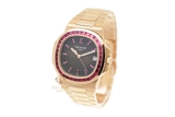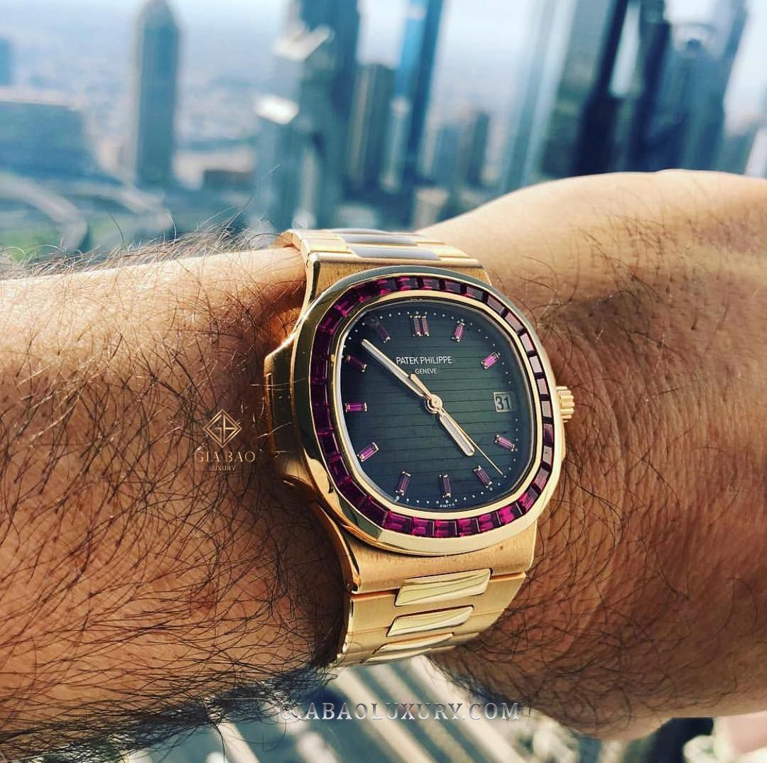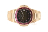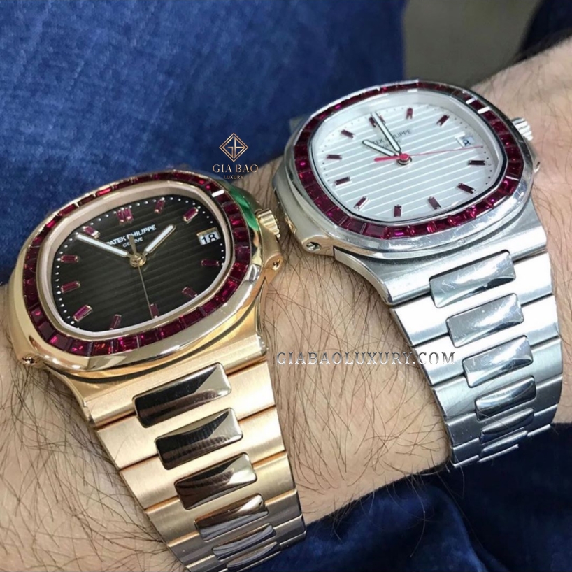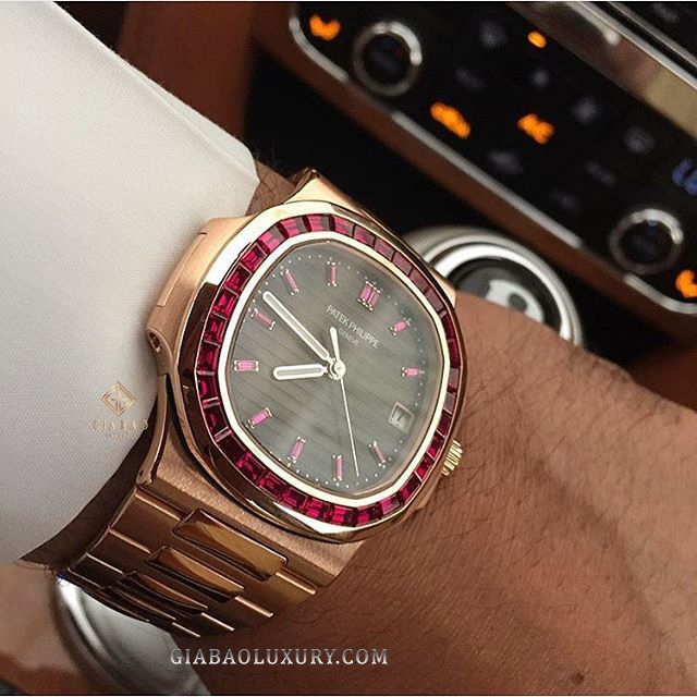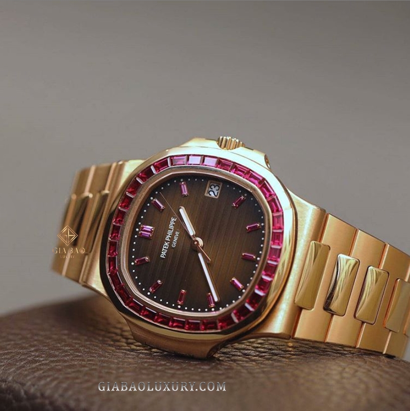Tuy nhiên, lần này Patek Philippe đã tạo nên một thiết kế khác biệt với việc sử dụng Ruby trên vành bezel và trên mặt số. Bộ vỏ Nautilus bằng vàng hồng vốn đã rất nổi bật, nay lại được trang trí thêm bởi những viên Ruby đỏ thắm. Đặc biệt hơn nữa, những viên Ruby này được cắt theo phương pháp Baguette - một phương pháp yêu cầu viên đá nguyên bản có kích thước lớn, và có độ hoàn hảo cao.