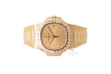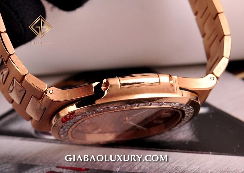 Kiểu dáng quen thuộc của chiếc “ tàu ngầm“ giờ đây đã được thiết kế trong bộ vỏ bằng vàng hồng nguyên khối 18k. Mỗi thương hiệu đều có một công thức khác nhau để tăng giá trị của mình, tuy nhiên thì khâu tuyển chọn đều như nhau về tính chất khắt khe và tỉ mỉ để lựa chọn ra “chất vàng “ tinh khiết nhất. Phần dây tiếp tục được thiết kế với 3 mối nối và phần mối nối ở giữa được đánh bóng, còn 2 bên được chải xước nhẹ nhàng mà tinh tế. Vành bezel cũng được thiết kế chuẩn mực, bề mặt được khảm những viên kim cương Baguette sang trọng. Việc khảm kim cương lên những chiếc vành của Nautilus đều được các nghệ nhân kim hoàn làm việc trong nhà máy của Patek Philippe thiết kế vô cùng công phu. Từ việc lựa chọn kim cương sao cho đồng đều về chất lượng và kích thước, các chấu khảm được căn chỉnh đều đến mức khó tin. Những viên kim cương sau khi được xếp lên vành sẽ được đánh dấu số thứ tự, sau đó mới đến việc thiết kế chân chấu giữ kim cương. Và tất cả các công đoạn trên đều được làm thủ công.