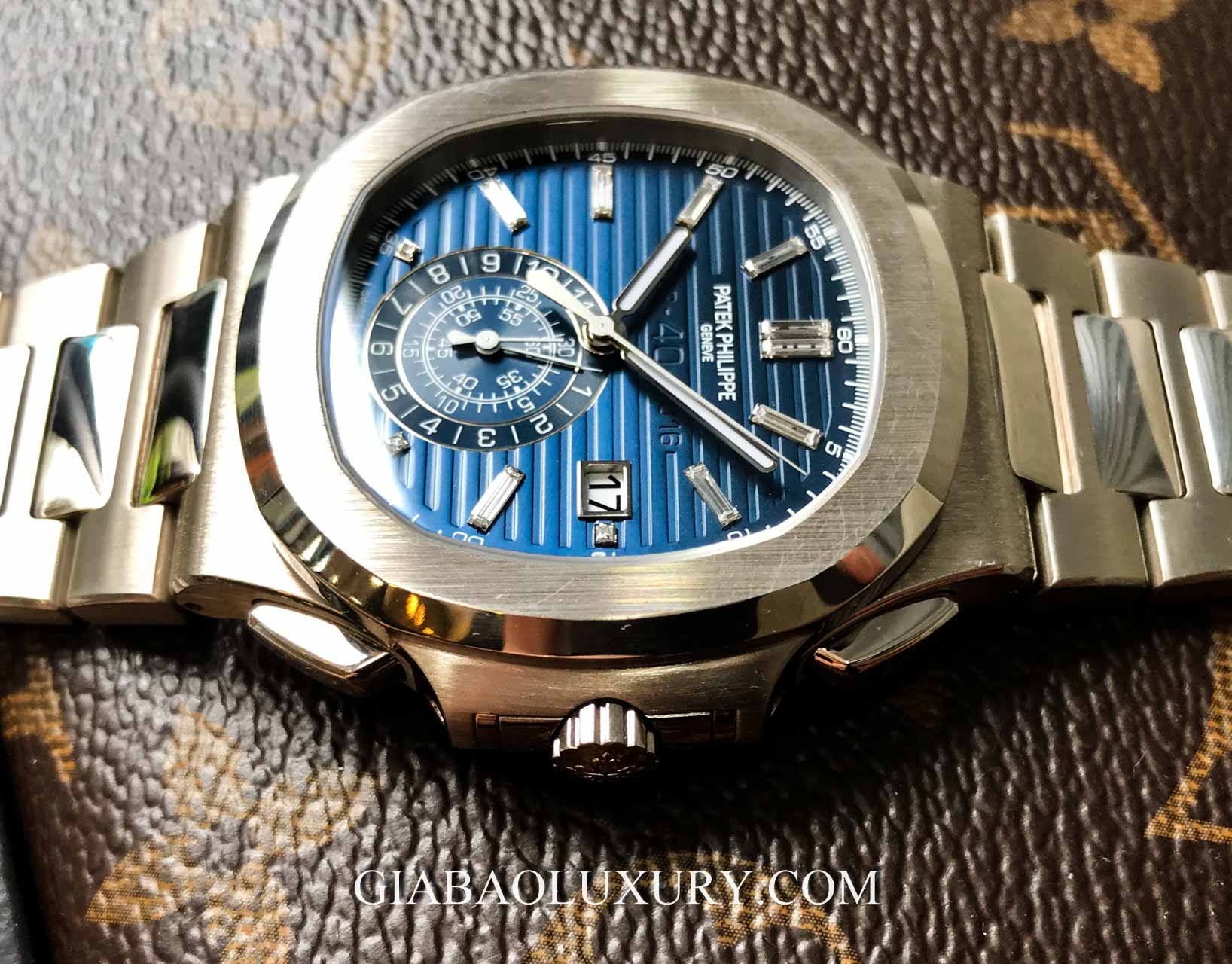 Trên mặt số xanh Navy sâu hút mắt, cụm dãy số tượng trưng của phiên bản kỷ niệm được đặt ngay dưới bộ tên của thương hiệu “1976-40-2016” tạo nên điểm nhấn cực lớn phân biệt rõ ràng với những bản Nautilus khác. Và gần như nó phá vỡ lối mòn xưa cũ khi dòng chữ này nổi bật hơn rất nhiều, sẵn sàng áp đảo dòng tên của thương hiệu” Patek Philippe Genève tinh tế ở góc 12 giờ.