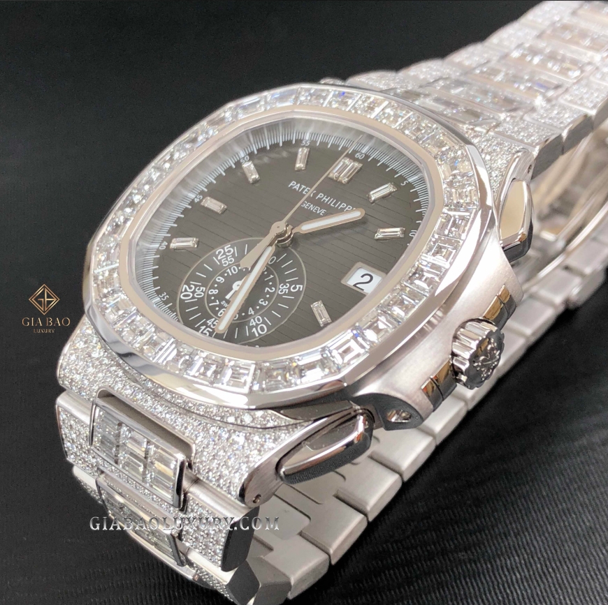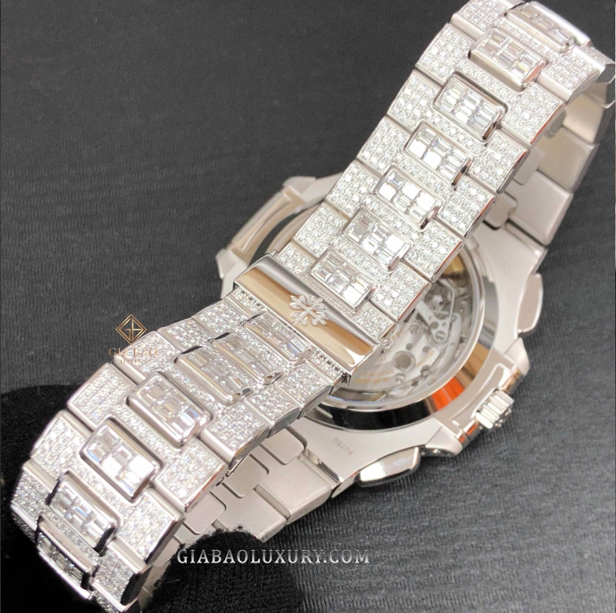 Chiếm trọn cảm tình của người sưu tầm, mẫu đồng hồ Patek Philippe Nautilus 5980/1400G-010 là một chiếc đồng hồ thể hiện sự đẳng cấp của nam giới. Trên bộ vỏ khác biệt bằng vàng hồng, những viên kim cương dáng baguette-cut được bố trí kín phần vành bezel và mối nối trung tâm của dây đeo đồng hồ. Những viên kim cương trong suốt kết hợp cùng chất liệu vàng trắng của bộ vỏ và bộ dây khiến cả chiếc đồng hồ trở nên đặc biệt lấp lánh.