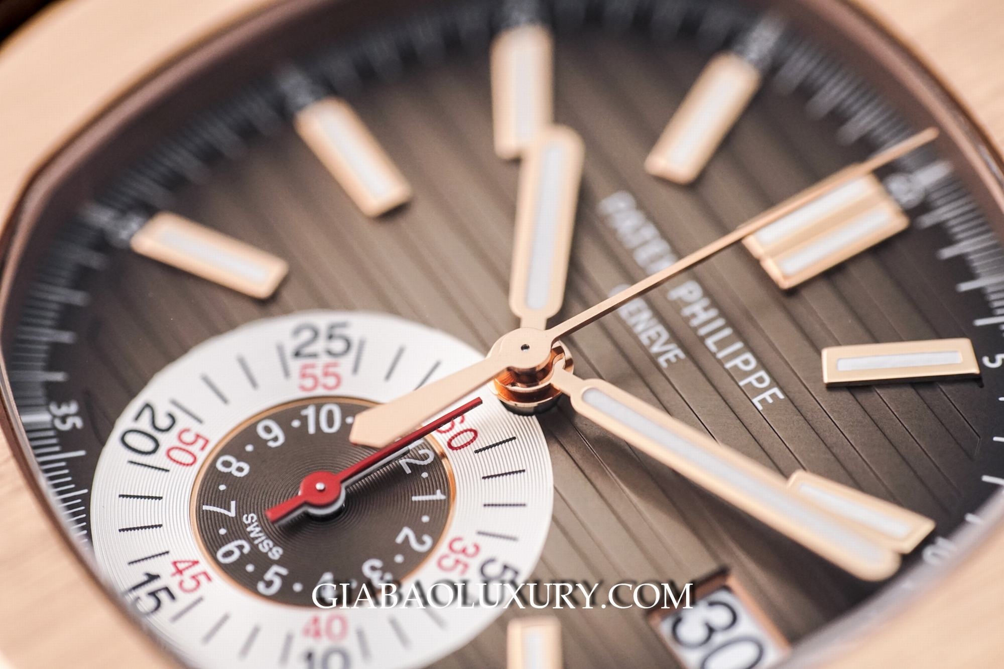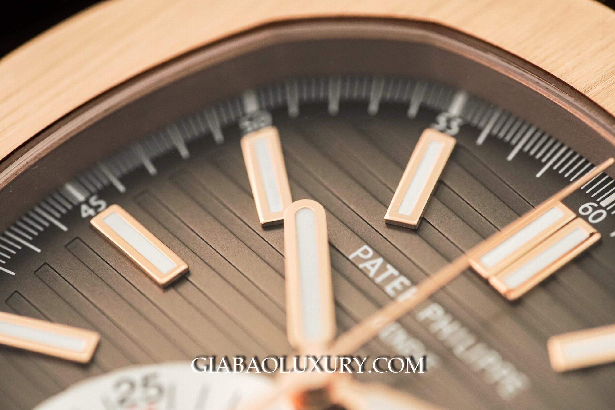 Tạo nên điểm cân bằng cho cả mặt số chiếc Nautilus 5980R-001 là hệ thống cọc chỉ giờ kích thước lớn và bộ 3 kim được phủ chất phát quang hiện đại nhất ngày nay, cùng một ô cửa sổ báo ngày nằm yên tại góc 3 giờ.