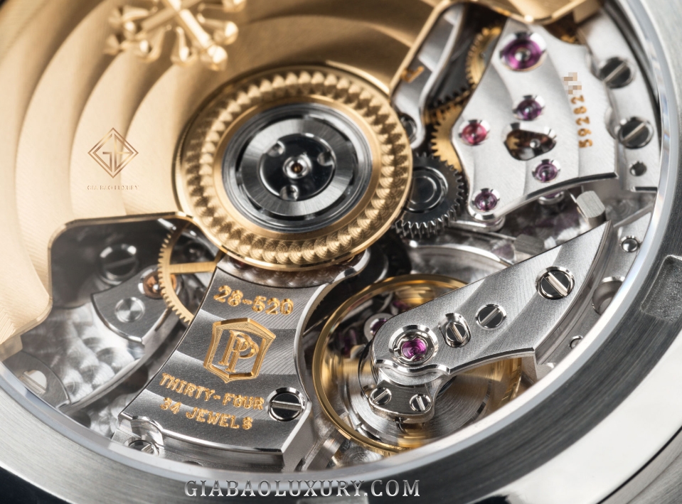Mặt sau đồng hồ là thiết kế lộ ½ máy nổi bật tấm rotor vàng được chạm khắc họa tiết hoa thị là logo thương hiệu Patek Philippe. Bộ máy được sử dụng trong tạo tác lần này là bộ máy automatic Caliber CH 28-520 C FUS có kích thước 31mm x 6,95mm cấu tạo từ 370 bộ phận, chứa 34 chân kính và mức dự trữ năng lượng đạt 45 giờ đồng hồ.
