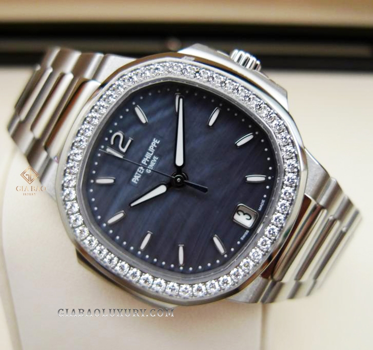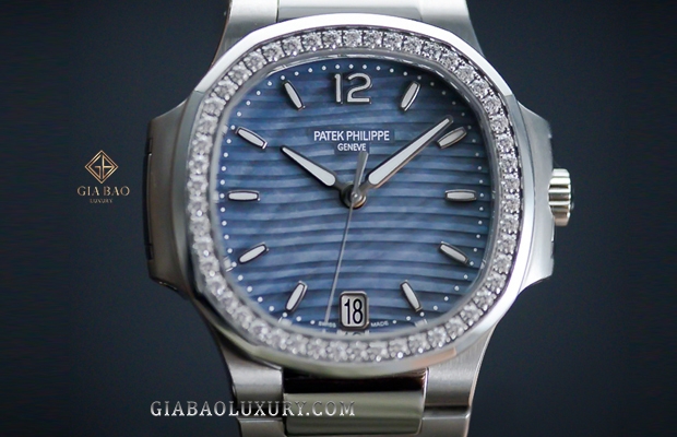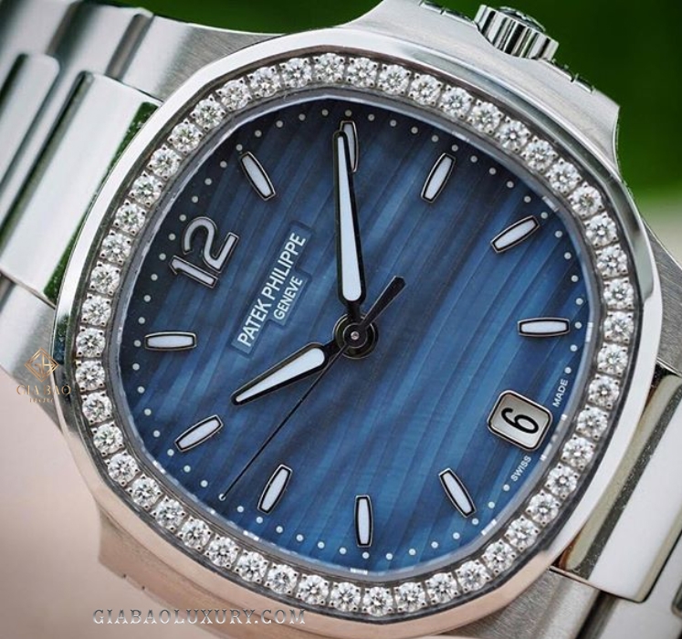 Đồng Hồ Patek Philippe Nautilus 7018/1A-010 gây ấn tượng với người mộ điệu ngay từ cái chạm nhìn đầu tiên bởi sự lấp lánh của 50 viên kim cương trang trí trên vành bezel.