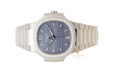 Đồng Hồ Patek Philippe Nautilus 7018/1A-010 gây ấn tượng với người hâm mộ ngay từ cái nhìn đầu tiên bởi sự lấp lánh tuyệt mỹ của 50 viên kim cương trang trí xung quanh vành bezel. Mặt số vỏ ngọc trai tạo sóng màu xanh vô cùng đặc biệt.