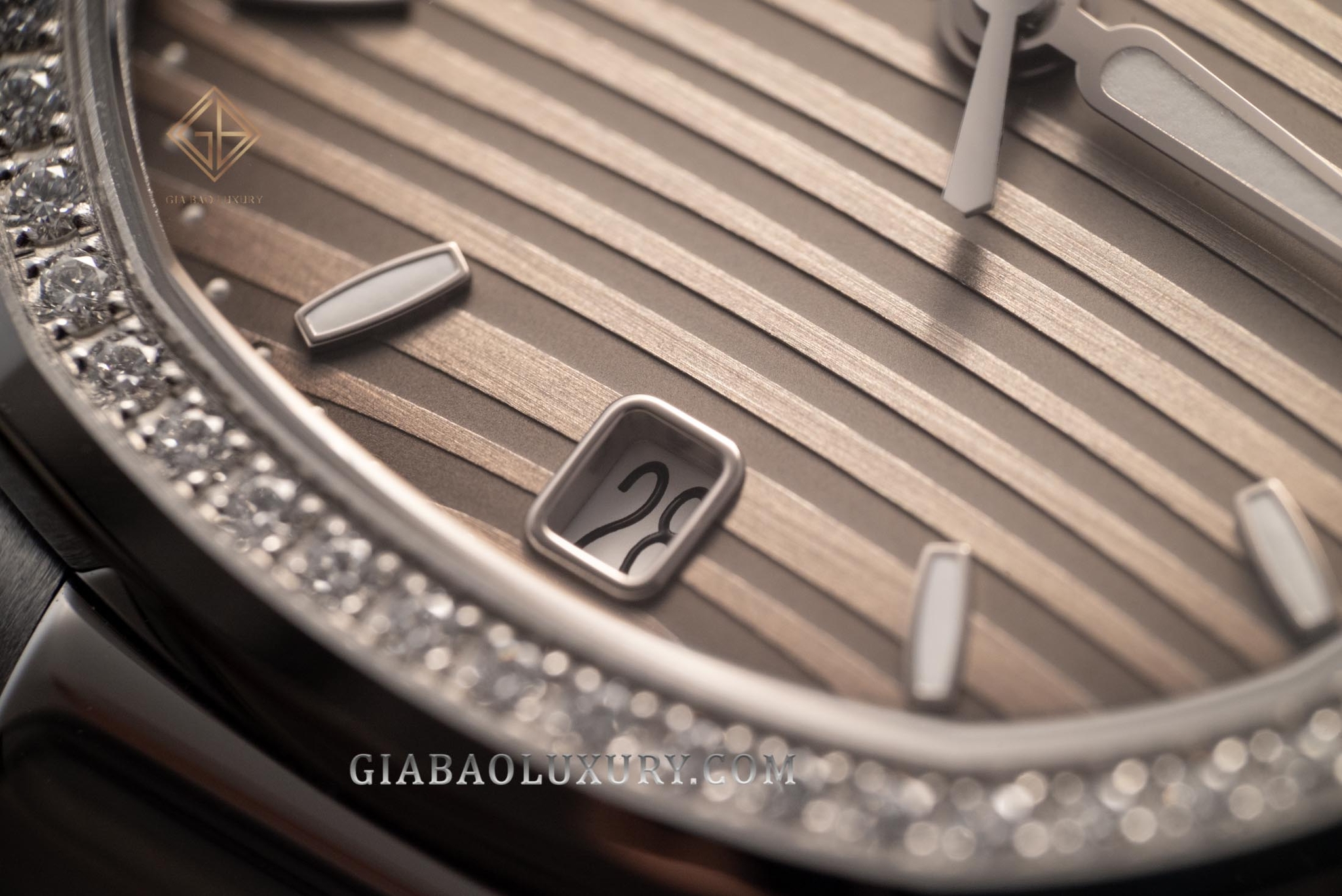 Sự cá tính ban đầu sẽ đến từ dáng vỏ hết sức đặc trưng của mẫu đồng hồ Patek Philippe 7118/1200A-011 hiện có mặt tại Gia Bảo Luxury này. Hiện lên tựa như một hình vuông đã được bo tròn các góc, trên vành bezel của chiếc Nautilus này được bổ sung 56 viên kim cương nguyên bản (0,67 cara) đã được tuyển chọn cũng như chế tác kỹ lượng từ khâu đầu vào. Từng viên kim cương xếp sát nhau và được cố định chặt chẽ bởi bốn chân chấu sáng loáng và nổi bật. Bên dưới phần vành lấp lánh chính là bộ vỏ khung đường kính 35,5mm từ thép không gỉ có thể kháng nước ở mức 60m.