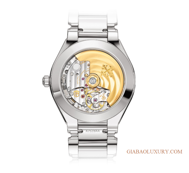 Cơ chế máy thiết kế khoe ra những chi tiết máy có độ hoàn thiện cực cao, quý cô có thể chiêm ngưỡng các chi tiết máy này phía sau lớp vỏ, nổi bật với rotor lên cót tự động bằng vàng vàng, họa tiết vân sọc Cotes de Geneve, các cầu máy được hoàn thiện tỷ mỷ vát cạnh cùng con dấu chính hãng Patek Philippe khắc viền vàng, khẳng định đẳng cấp chất lượng của chính thương hiệu đình đám này.