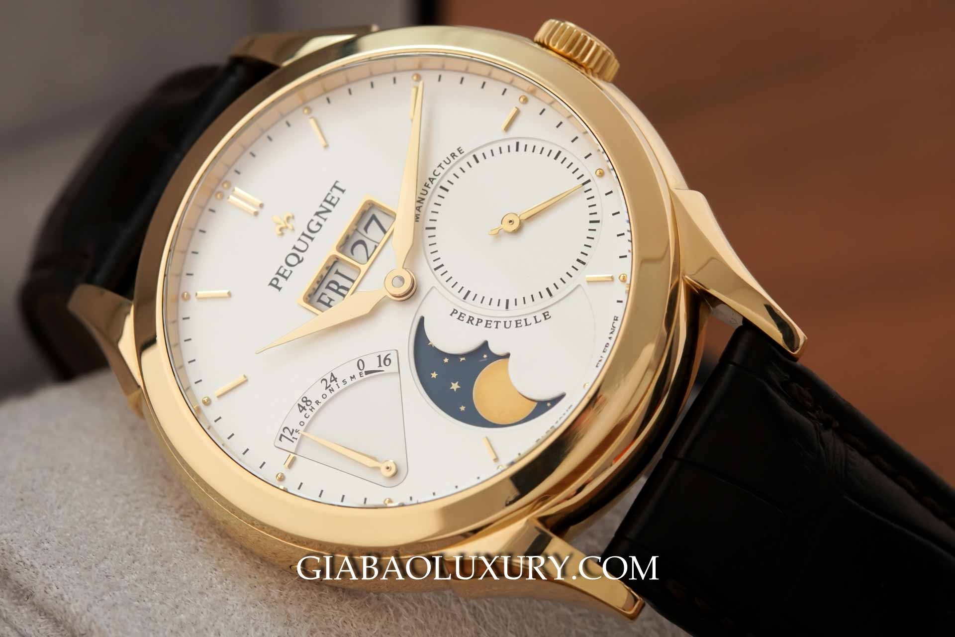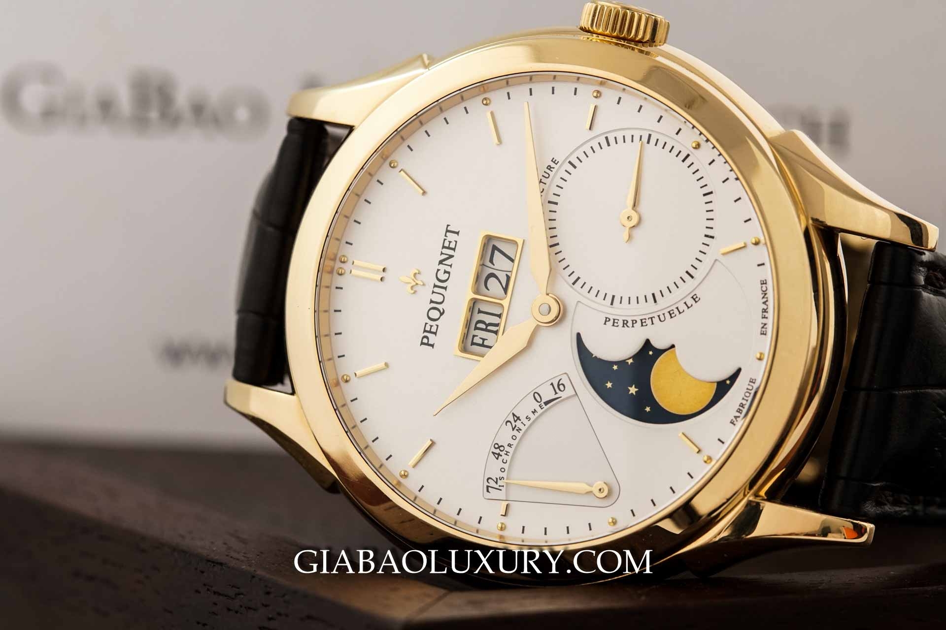 Tại Gia Bảo Luxury ngày hôm nay là mẫu đồng hồ nằm trong bộ sưu tập biểu tượng, mang về nhiều tiếng vang cho thương hiệu Pequignet, có tên gọi Rue Royale Moonphase có số hiệu 9011438CN trong chất liệu vàng vàng 18K đẳng cấp.