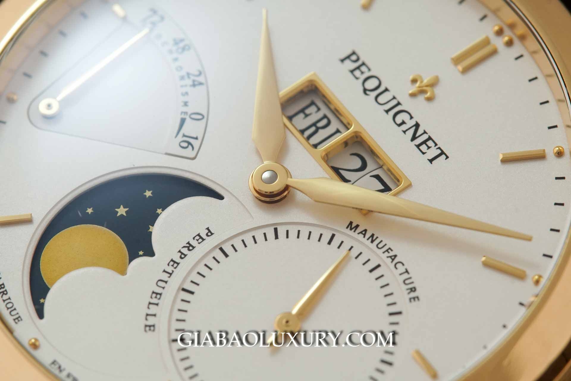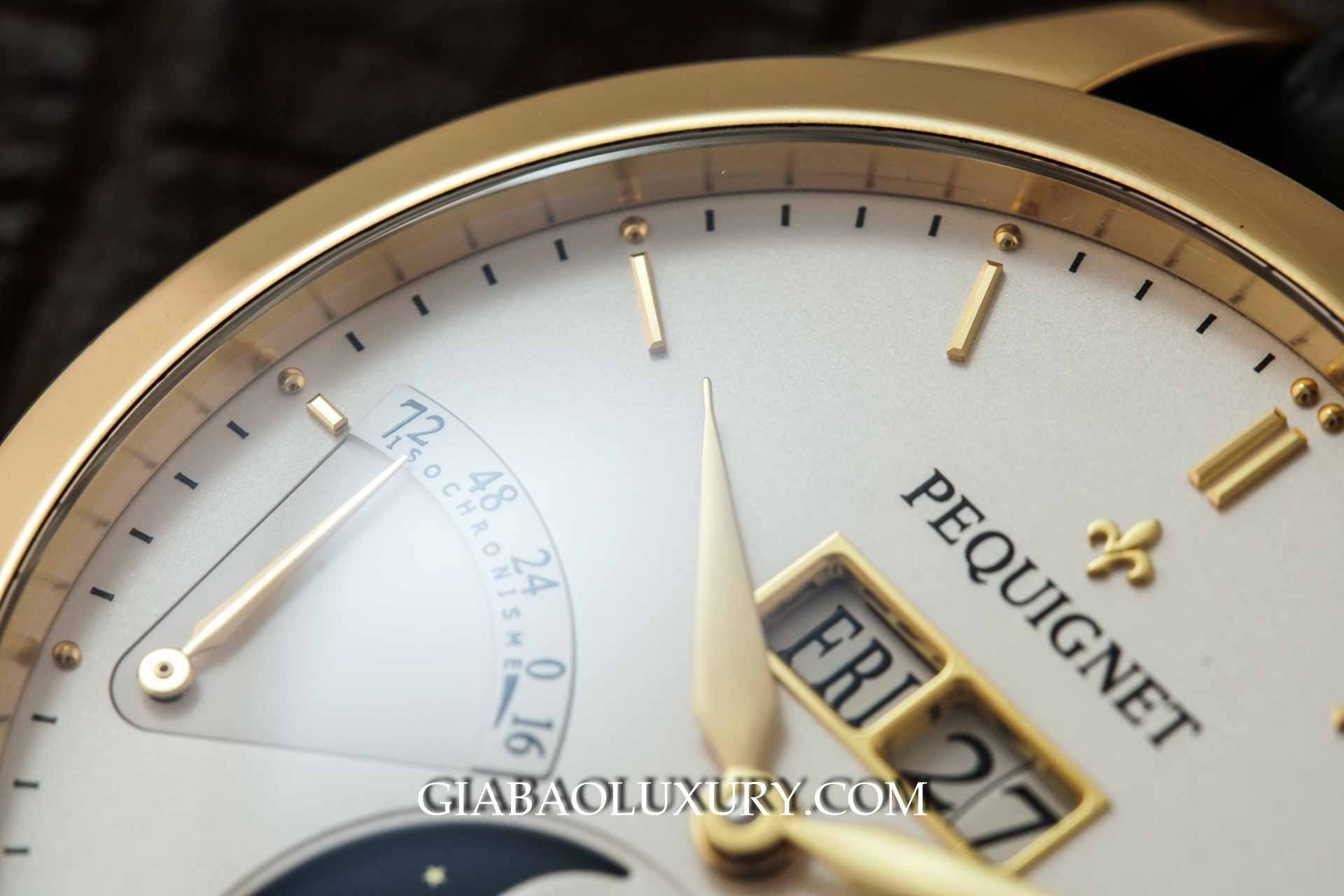 Đặc biệt, Pequignet Rue Royale Moonphase lại ghi dấu ấn trong lòng người yêu đồng hồ bởi những chi tiết trên mặt số bạc được thiết kế mang đậm chất tình của nước Pháp. Ngoài cùng là hệ thống cọc chỉ giờ bằng vàng hồng trong kiểu dáng hình thang cổ điển. Hệ thống cọc chỉ giờ được đính nổi bật bên trong các dấu chấm đếm phút hỗn hợp. Bên dưới logo bằng vàng sáng bóng cùng tên thương hiệu Pequignet trong phông chữ đơn giản góc 12 giờ là hai ô của sổ báo tháng và ngày kích thước lớn, tiện dụng.