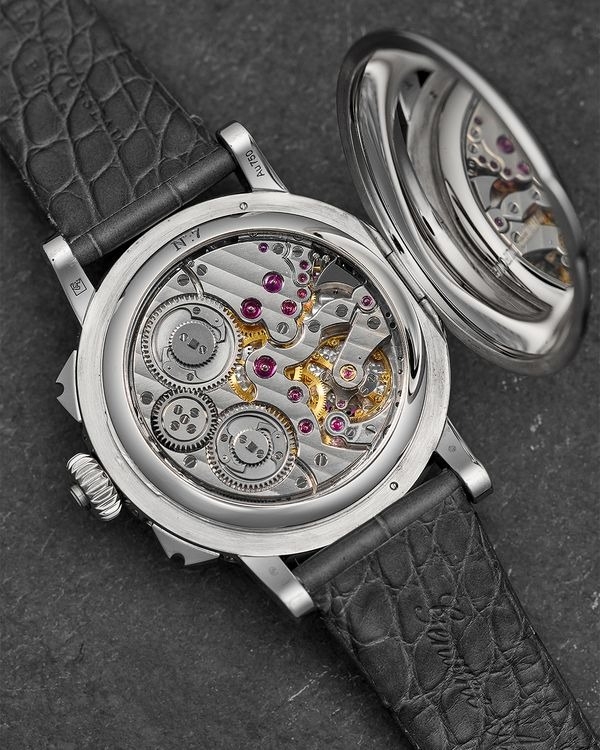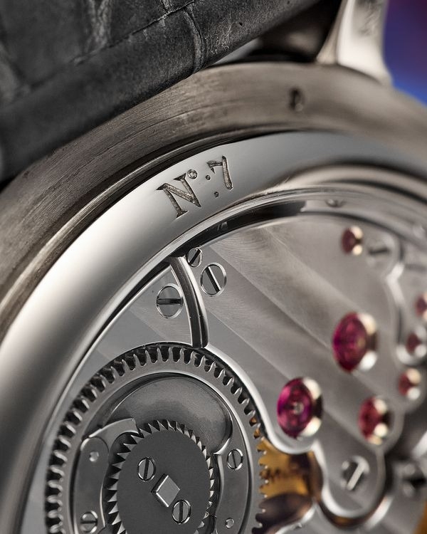 Chiếc đồng hồ No. 07 thuộc dòng Grande & Petite Sonnerie, một cơ chế phức tạp có khả năng điểm chuông giờ và phút tự động. Được chế tác từ vàng trắng với mặt số sapphire trong suốt, mẫu No. 07 là chiếc duy nhất kết hợp mặt số mở cùng thiết kế vỏ dạng hunter caseback, giúp quan sát bộ máy từ cả mặt trước và sau.