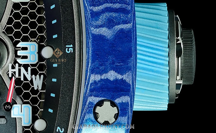 Trên núm vặn chỉnh giờ của chiếc Richard Mille RM022 Tourbillon AERODYNE BLUE cũng có một nút bấm, dùng để chỉnh trạng thái của núm vặn. Trạng thái này được thể hiện trên mặt số, dưới mốc 3 giờ. Với cơ chế này, người dùng sẽ không phải rút núm vặn ra nữa, tránh được tình trạng “bay núm”.