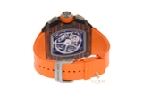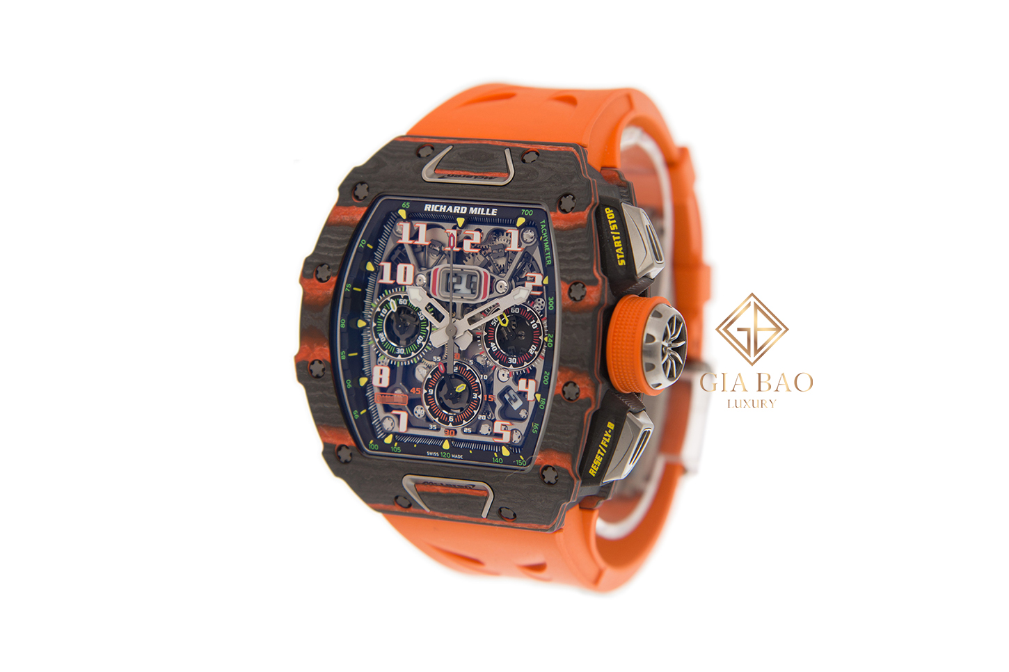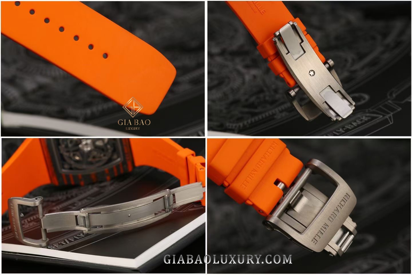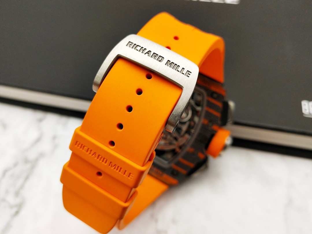 Thực tế, Richard Mille đã trang bị cho RM 11-03 hai loại dây đeo tùy theo sở thích. Yêu thích sự năng động, trẻ trung người đeo sẽ lựa chọn dây cao su với màu cam ăn khớp với đệm trên núm điều chỉnh. Còn muốn hướng đến sự thể thao thì dây đeo cao su màu đen là hợp lý nhất.