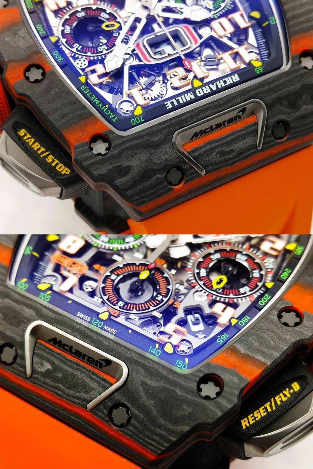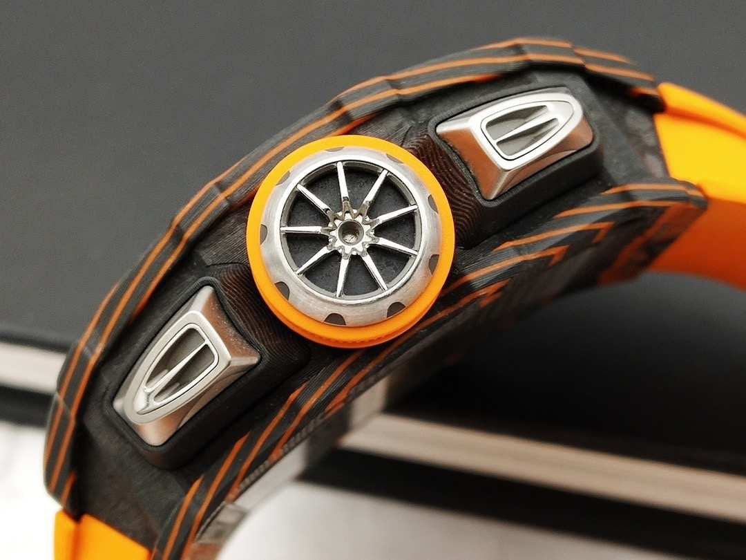 Lấy nguồn cảm hứng từ chiếc siêu xe McLaren 720S nổi trội trên đường đua, nút bấm chronograph tại cạnh bên cong vát của RM 11-03 đều hiện lên bằng titanium siêu cứng, và cũng siêu nhẹ. Đồng hành cùng nút bấm là hình ống xả khí thải trên siêu xe McLaren đặt tại góc 6 và 12 giờ trên vành bezel.
