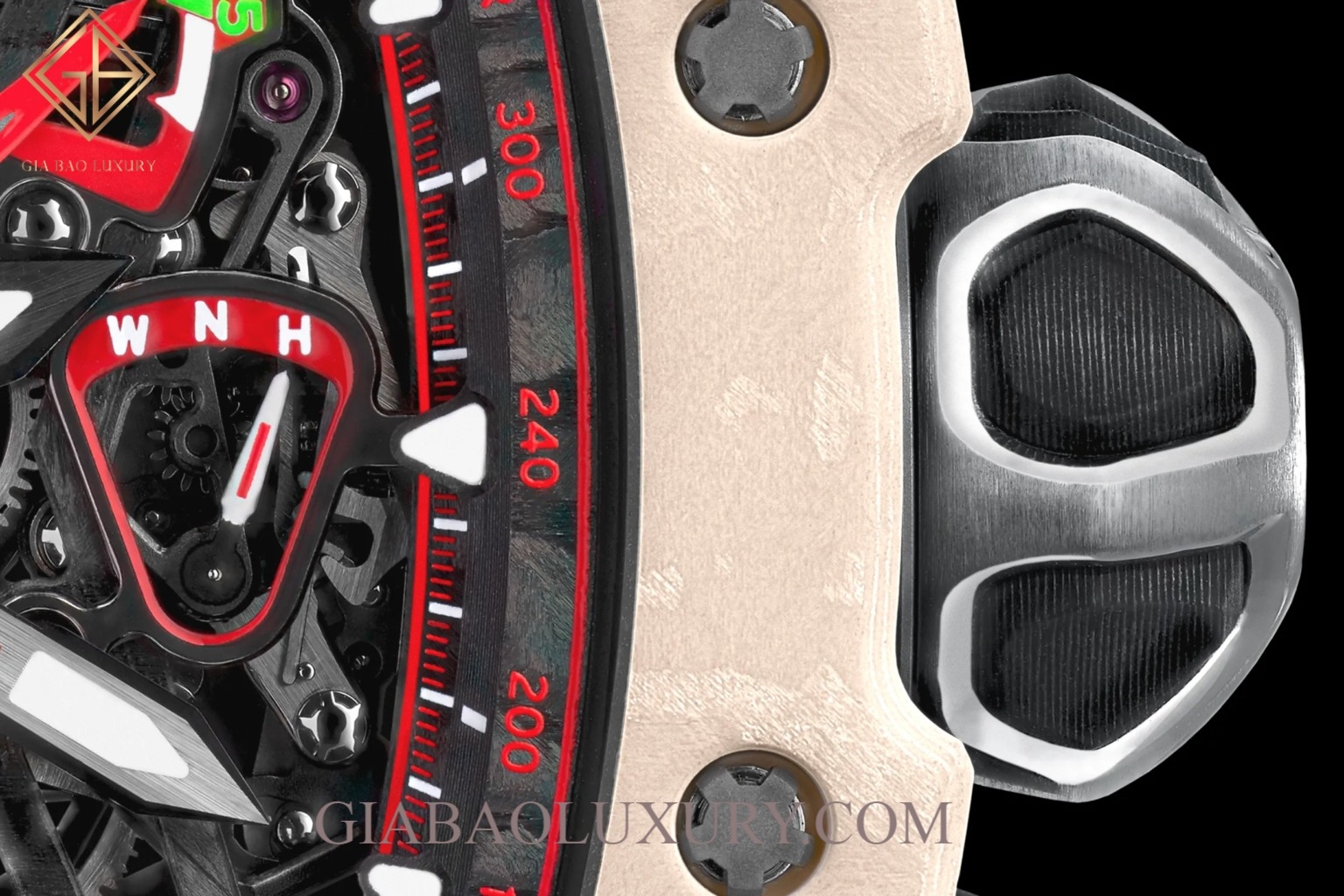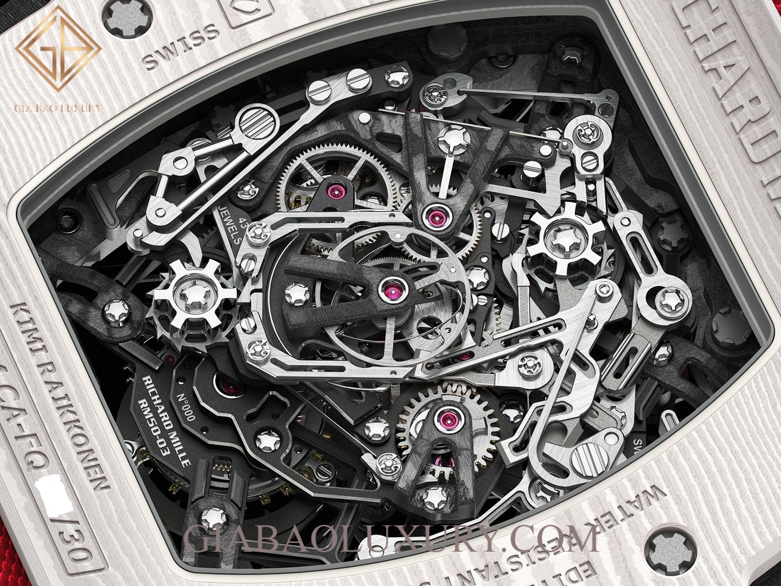 Việc phát triển các vật liệu này chính là nhờ sự kết hợp giữa Richard Mille với viện công nghệ North Thin Ply của Thụy Sĩ, cả 2 đã bắt tay hoàn thiện quy trình sản xuất phức tạp chỉ để sản xuất ra vật liệu thạch anh trắng của bộ vỏ mà chúng ta đã thấy. Quá trình này bao gồm việc sử dụng 600 lớp silicon (mỗi lớp silicon này chỉ dày 45 micron) và tẩm chúng trong một chất liệu đặc biệt trước khi được xử lý ở nhiệt độ 120 độ C. Chính vì thế, bộ vỏ này có trọng lượng siêu nhẹ, không gây dị ứng và chống tia UV. Ở bên cạnh sườn, bộ 3 núm chỉnh giờ được thiết kế cách điệu mà nếu như chúng ta để ý sẽ thấy nó rất giống chiếc C38 mà Kimi điều khiển trong cuộc đua.