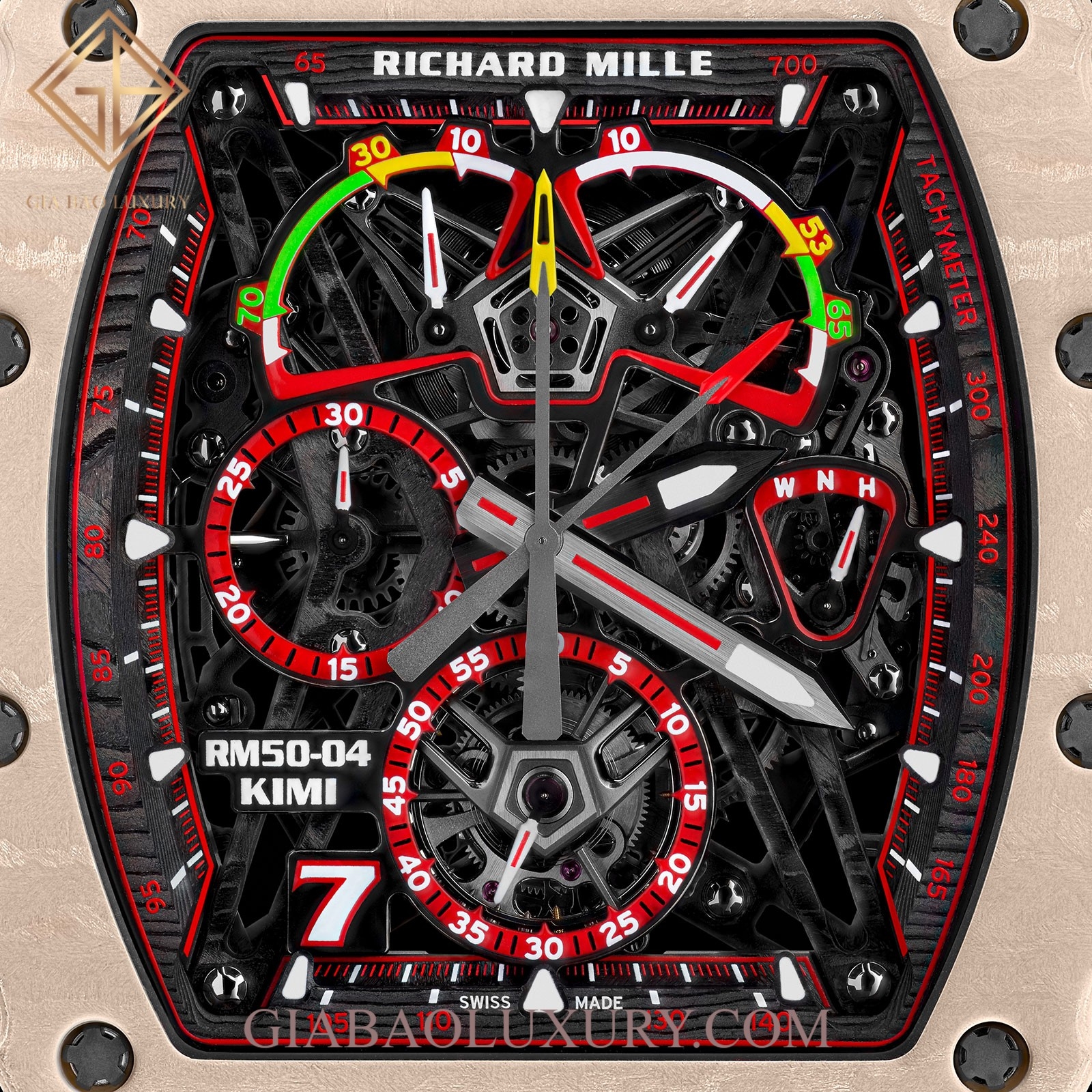 Trên mặt số khá phức tạp nhưng “chất” của chiếc RM50-04, chúng ta có thể thấy được cách thiết kế rất đặc biệt, nó giống như bảng báo điện tử phía dưới vô lăng của chiếc xe. Ở góc 12h được chia 2 cung tròn, cung bên trái là chỉ báo năng lượng dự trữ của chiếc đồng hồ, còn khung bên phải chính là cung hiển thị lực mô men xoắn. Lực mô men xoắn thể hiện sự ổn định của chiếc đồng hồ. Theo như thông tin từ chính Richard Mille thì đối với chiếc RM50-04 này nếu kim chỉ dưới 53Nmm tức là lực bị chùng còn trên 65Nmm nghĩa là bị quá căng. Điều này ảnh hưởng không tốt đến sự ổn định của bộ máy cơ học.