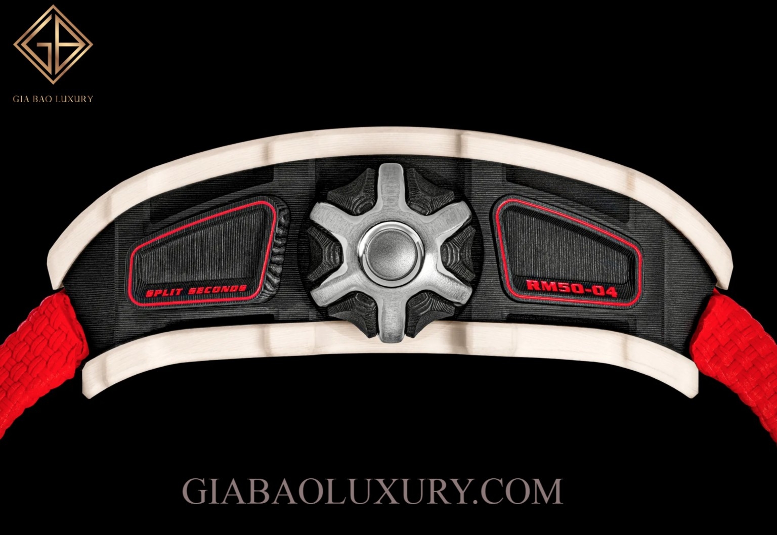 Lật mặt sau để chiêm ngưỡng sự phức tạp của bộ máy RM50-03 mà Richard Mille trang bị cho chiếc đồng hồ này. Vô số các chi tiết mảnh mai có vẻ như đặt chồng chéo nhưng thực ra lại tôn trọng quy luật của nhà sản xuất. Bộ cót được đặt ở chính giữa, chỉ khi nhìn từ mặt trên chúng ta mới có thể thấy. Lồng quay Tourbillon được đặt ở giữa bộ máy, cố định bởi các cầu máy và các thanh giữ được làm từ Titanium 5N. Đây là bộ máy lên giây kinh điển của nhà Richard Mille với 43 chân kính, tần số dao động 21.600vph cùng với thời gian trữ năng lượng 70 giờ đồng hồ. Mẫu đồng hồ Richard Mille RM50-04 Tourbillon Split Second Chronograph được sản xuất giới hạn chỉ 30 chiếc trên toàn cầu.
