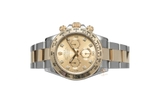 Rolex Cosmograph Daytona 116503 hoàn thiện từ chất liệu thép không gỉ 904L kết hợp với vàng 18k. Mặt số vàng champagne cuốn hút và nổi vật với các cọc số kim cương thiên nhiên. Ba mặt số phụ biểu hiện cho tính năng bấm giờ chronograph bao gồm: mặt số phụ chỉ 12 tiếng ở vị trí 9 giờ, mặt số phụ chỉ 30 phút ở vị trí 3 giờ và mặt số phụ góc 6h hiển thị kim giây của đồng hồ. ![]()