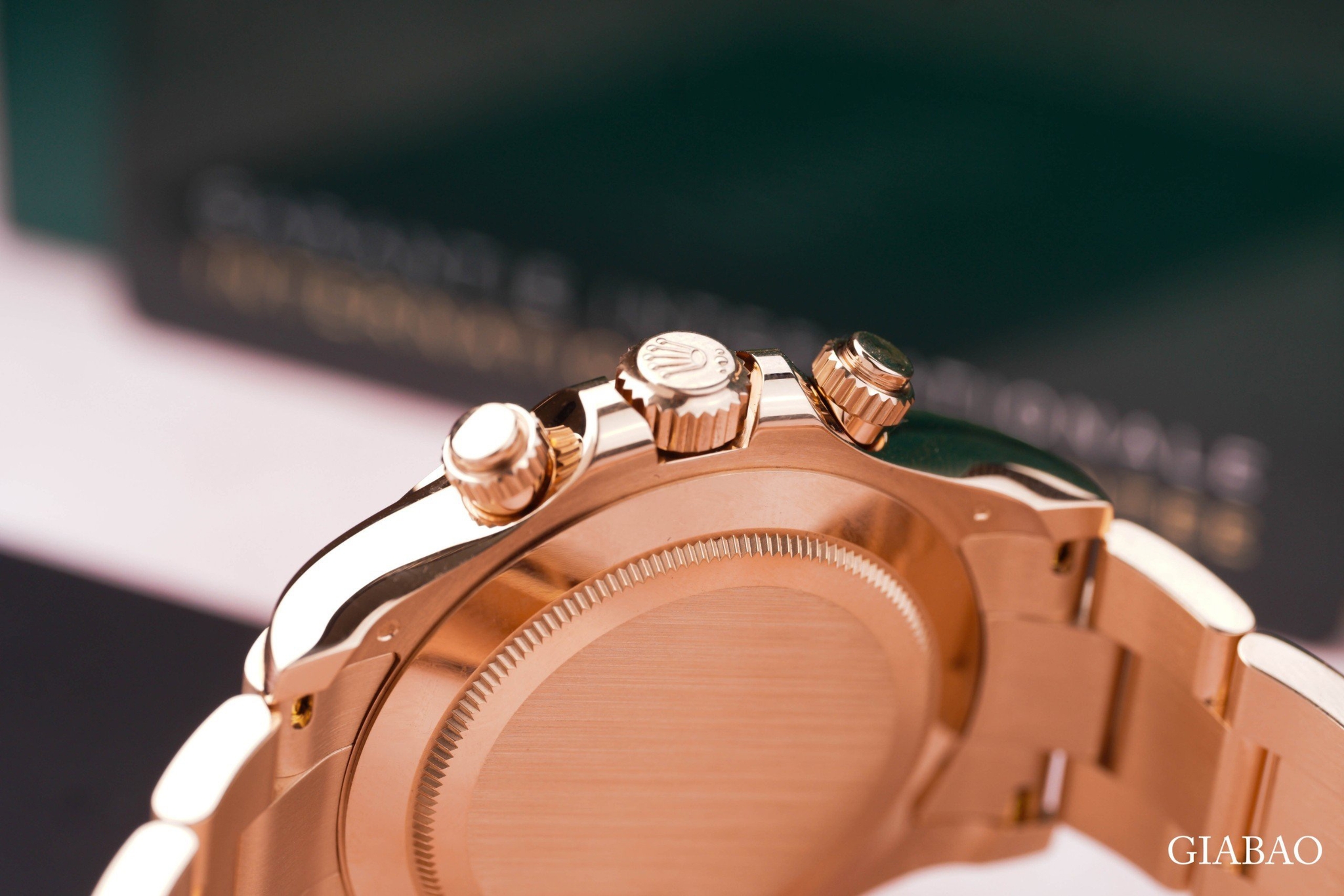 Phía trên mặt số đó là cách chi tiết được làm từ vàng hồng, có phủ thêm chất phản quang Chromalight độc quyền của Rolex. Riêng ở góc 12 giờ, ta không có cọc số phản quang và thay vào đó là biểu tượng vương miện quen thuộc của thương hiệu. Ba mặt số phụ của cơ chế Chronograph vẫn sẽ xuất hiện, được làm nổi bật hơn với nền đen và các đường viền bằng vàng.