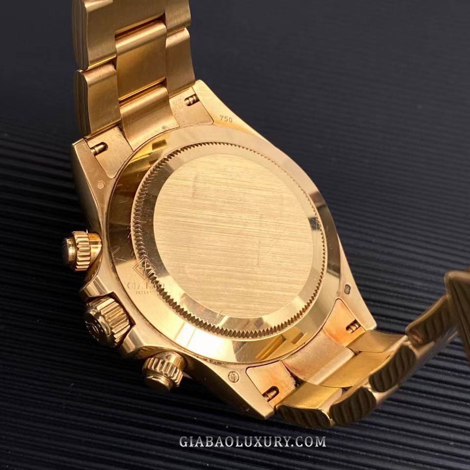 Rolex Cosmograph Daytona 116508 được làm bằng vàng vàng 18k với mặt số màu vàng hoàn thiện chải tia, cọc số kim cương, dây đeo Oyster tích hợp vành bezel bằng vàng vàng 18k và thang đo tốc độ được chạm khắc một cách tinh xảo. Rolex Cosmograph Daytona 116508 có kích thước 40mm, một sự lựa chọn phù hợp với cổ tay săn chắc của các tay đua thể thao thứ thiệt.