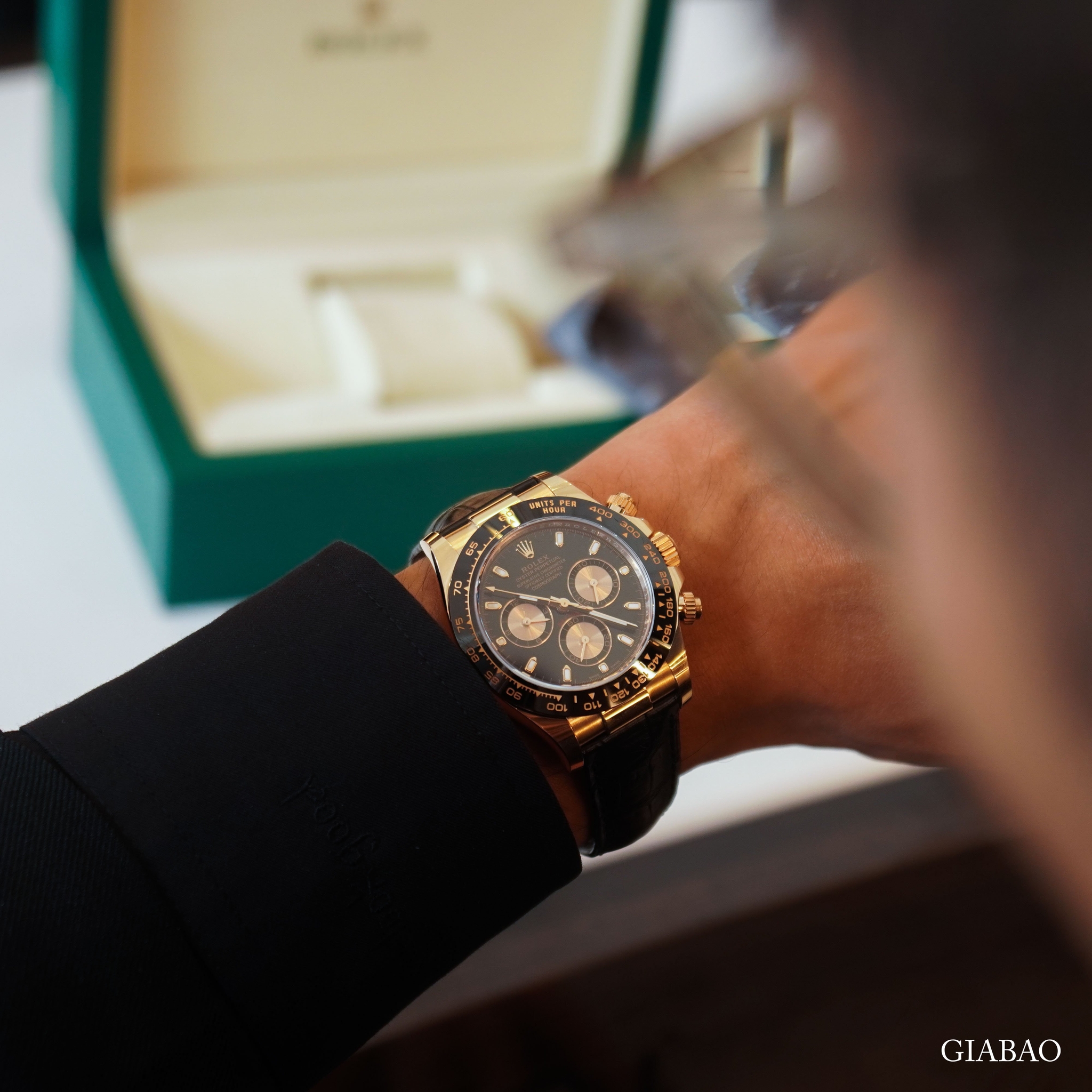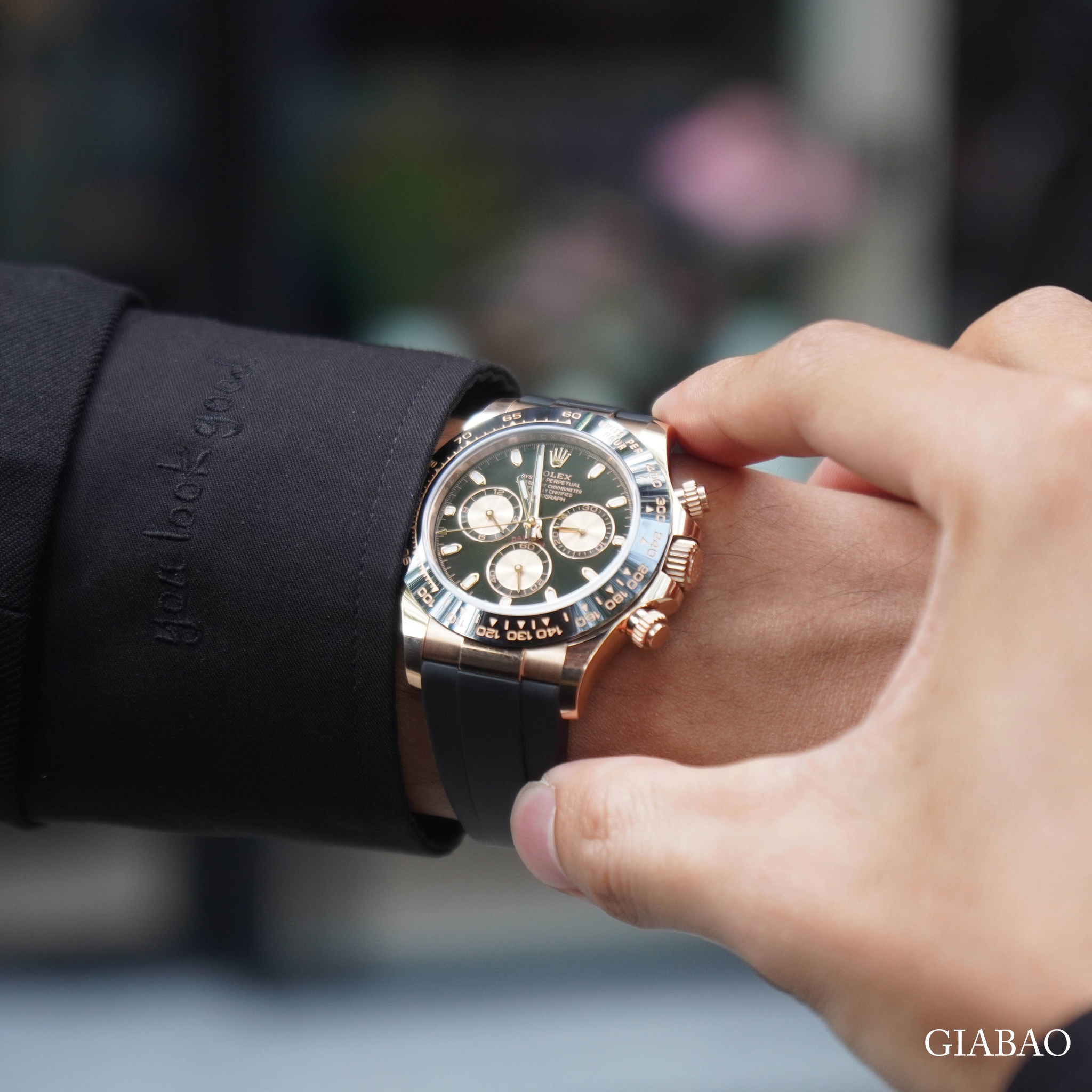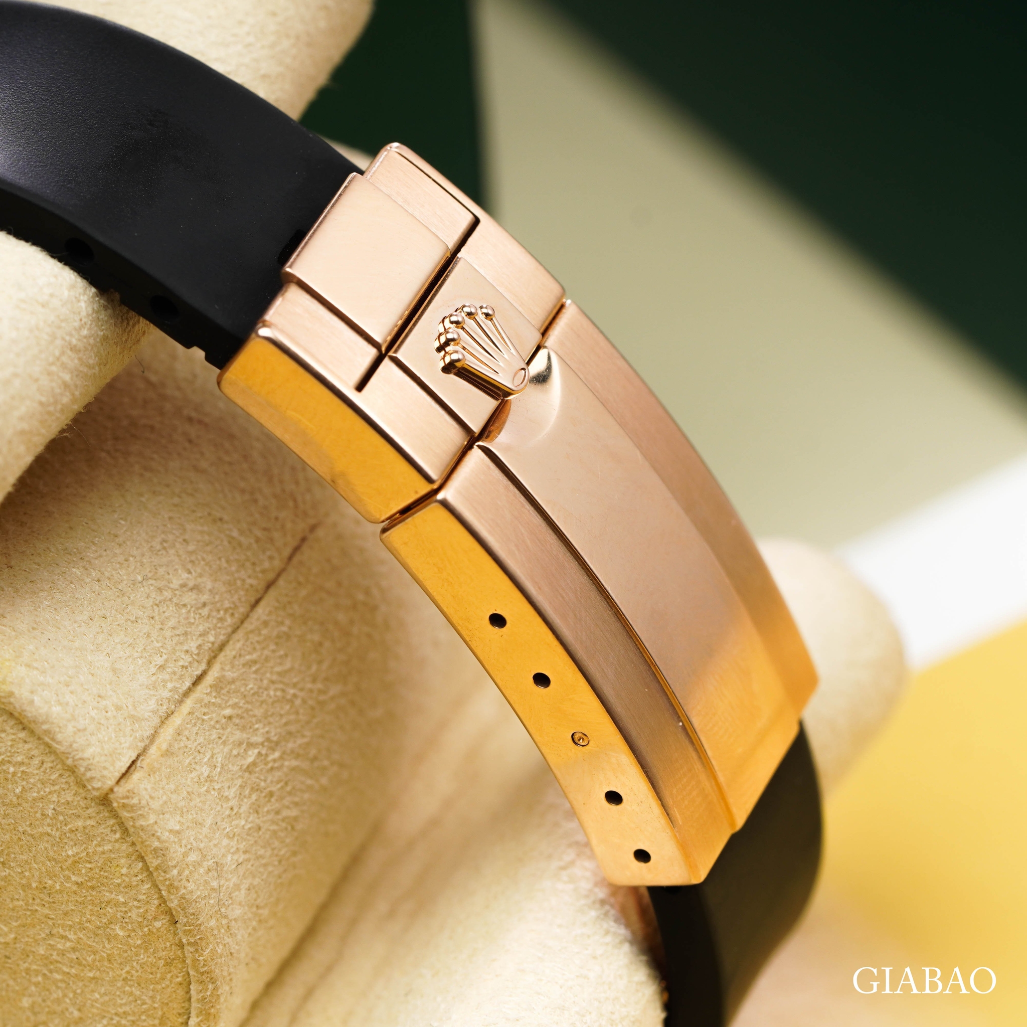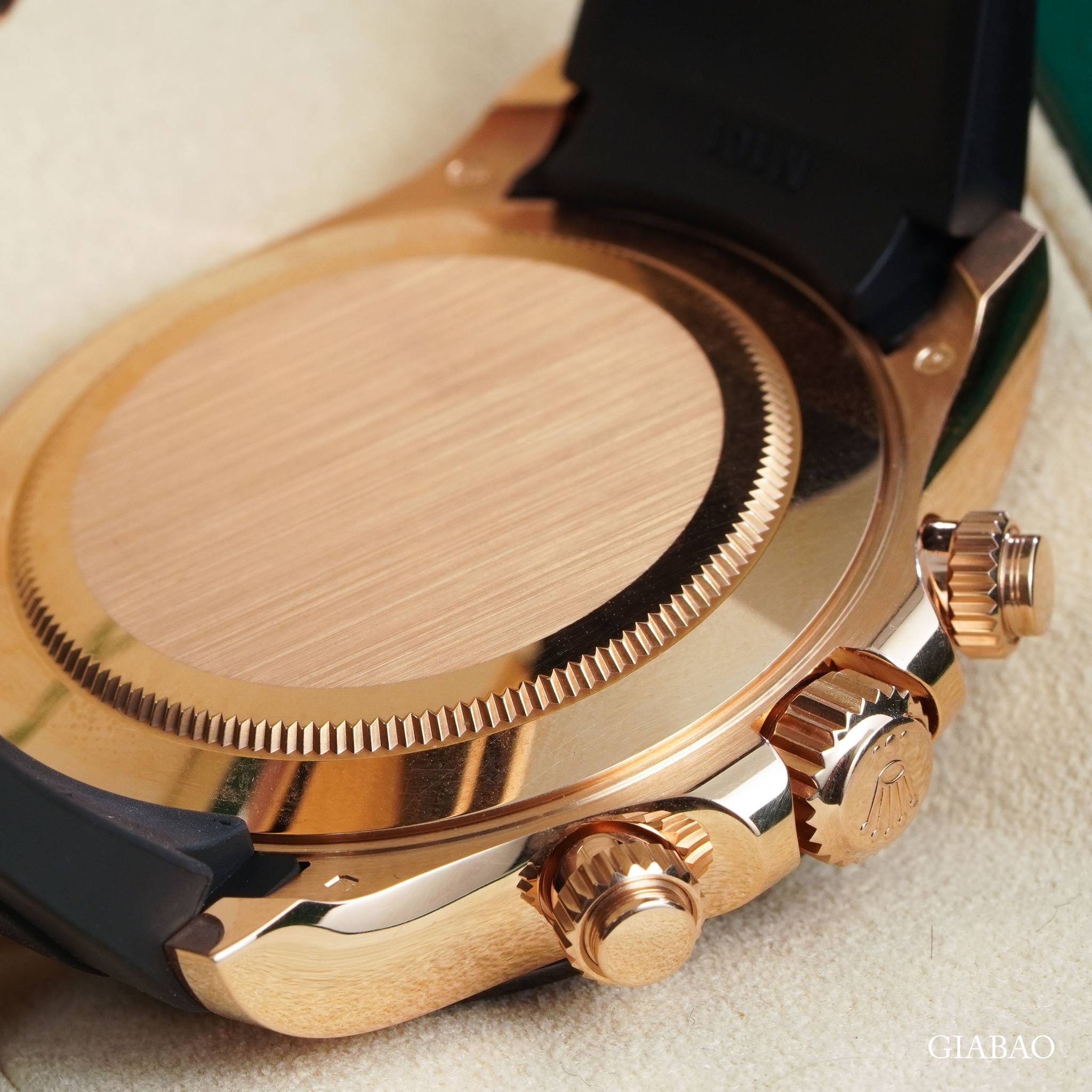 Chiếc đồng hồ giữ chức năng bấm giờ chính xác được thể hiện qua các mặt số phụ trên mặt số và các nút bấm đều bằng vàng Everose phía cạnh phải của vỏ. Kết hợp với một thiết kế thể thao như vậy, Rolex sử dụng dây đeo bằng da cá sấu màu đen, cùng khoá gập cùng chất liệu Everose như bộ vỏ 40mm. Dù là một thiết kế ra đời đầu tiên để xuất hiện trong những trường đua mạo hiểm, Rolex vẫn đảm bảo cho đồng hồ Daytona một khả năng kháng nước ấn tượng. Trong ví dụ cụ thể này, Rolex Cosmograph Daytona 116515LN có thể kháng nước ở mức 100m.