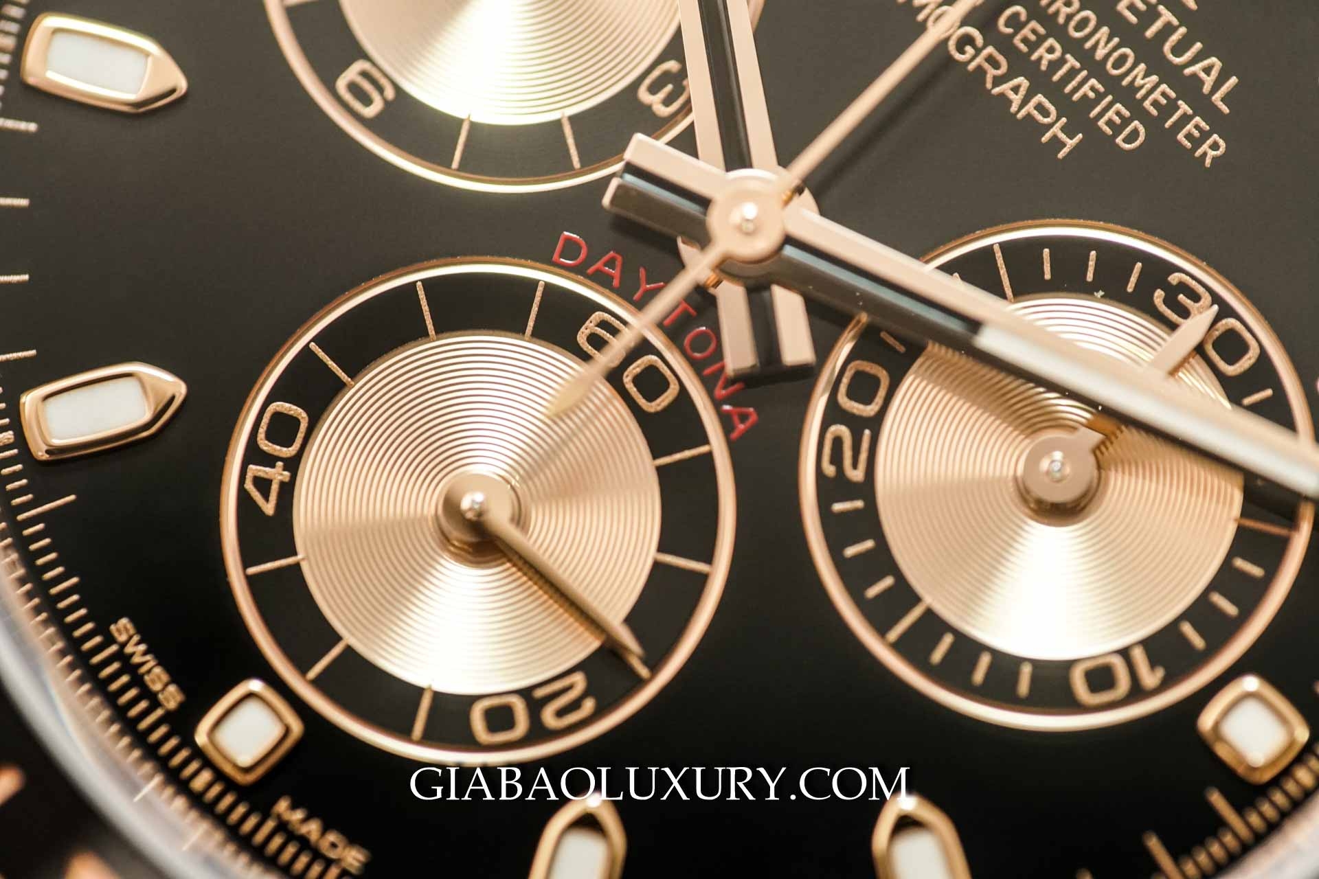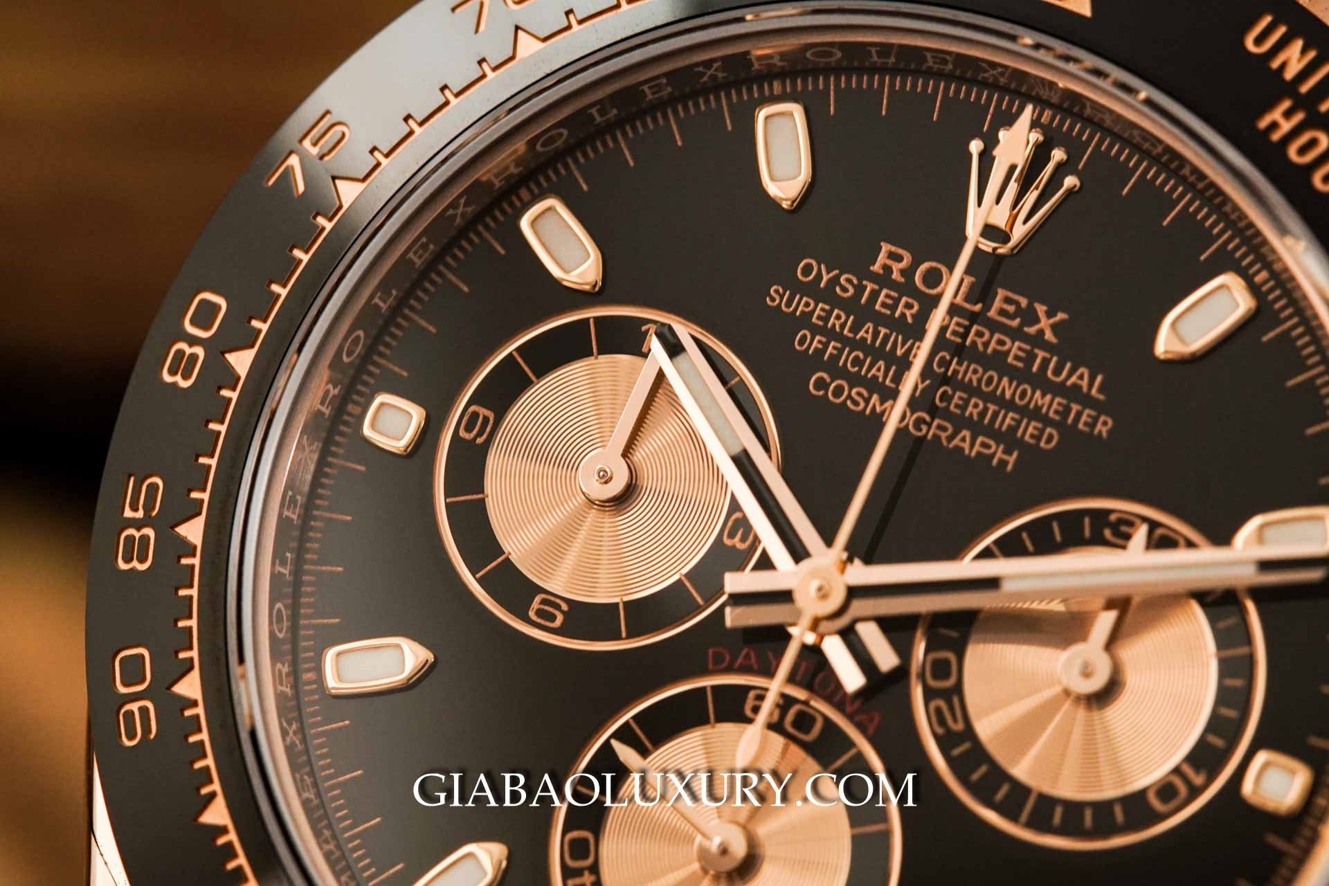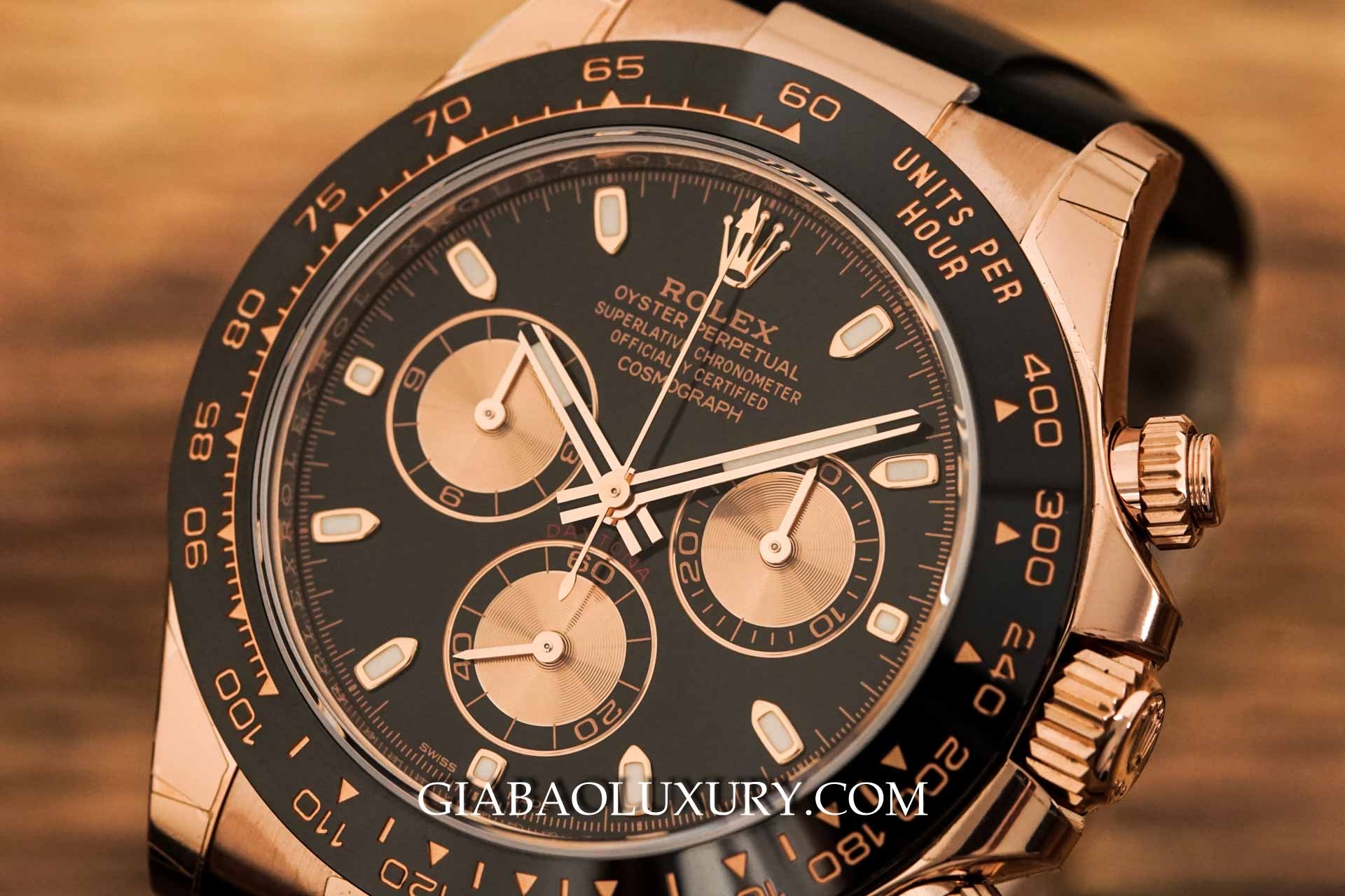 Rolex Cosmograph Daytona 116515 hoàn thiện từ chất liệu vàng hồng 18k kết hợp cùng với dây cao su. Mặt số đen-hồng cuốn hút và nổi vật với các cọc kim bằng vàng hồng. Ba mặt số phụ biểu hiện cho tính năng bấm giờ chronograph bao gồm: mặt số phụ chỉ 12 tiếng ở vị trí 9 giờ, mặt số phụ chỉ 30 phút ở vị trí 3 giờ và mặt số phụ góc 6h hiển thị kim giây của đồng hồ. Nổi bật trên mặt số duy nhất có lẽ là tên bộ sưu tập Daytona được thiết kế màu đỏ - tách biệt hẳn với tên các chi tiết khác như tên thương hiệu, logo và các chữ số khác bằng màu trắng.